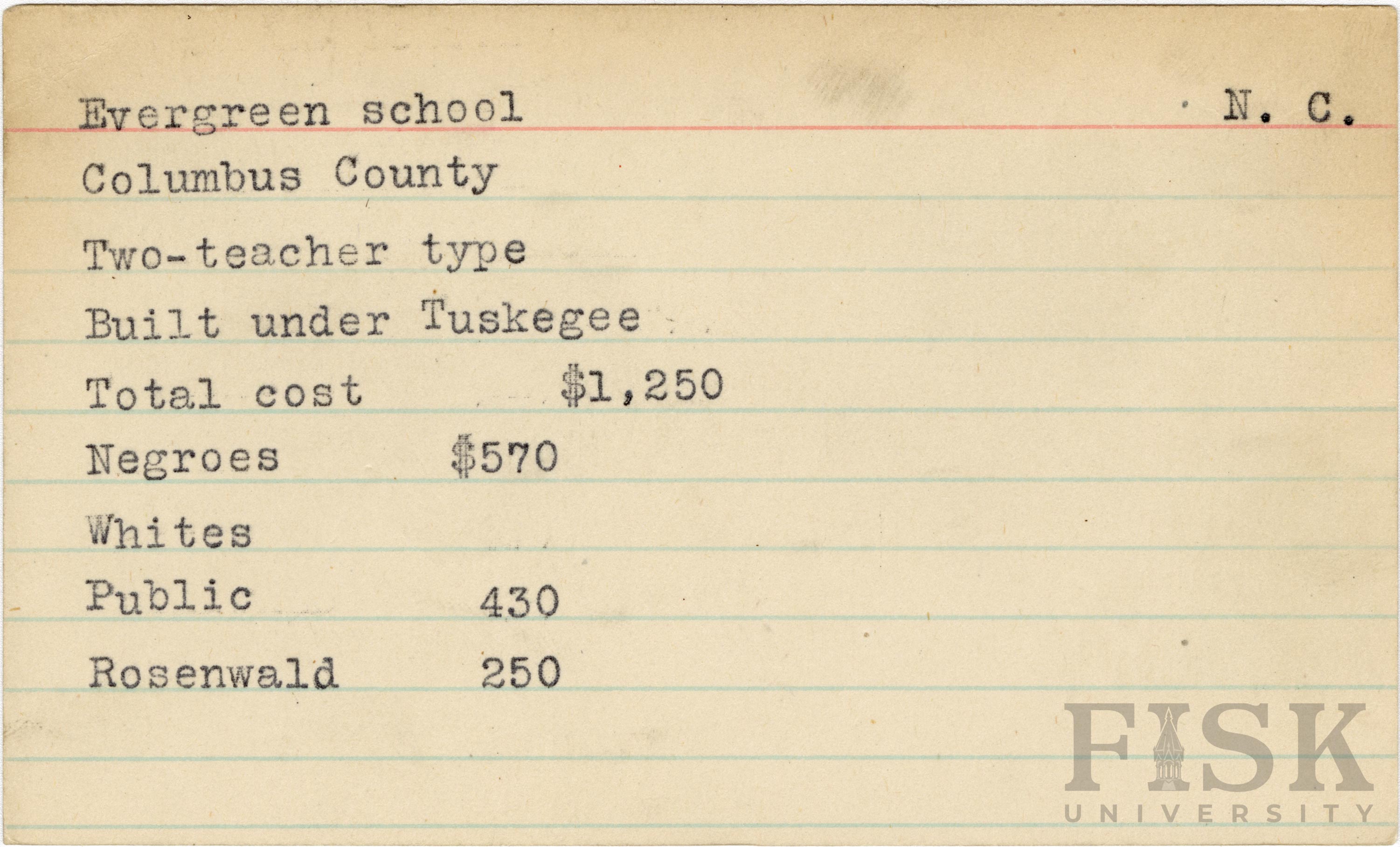 - Julius Rosenwald Fund--Buildings, African American schools--History--20th century, African American schools--Evergreen School