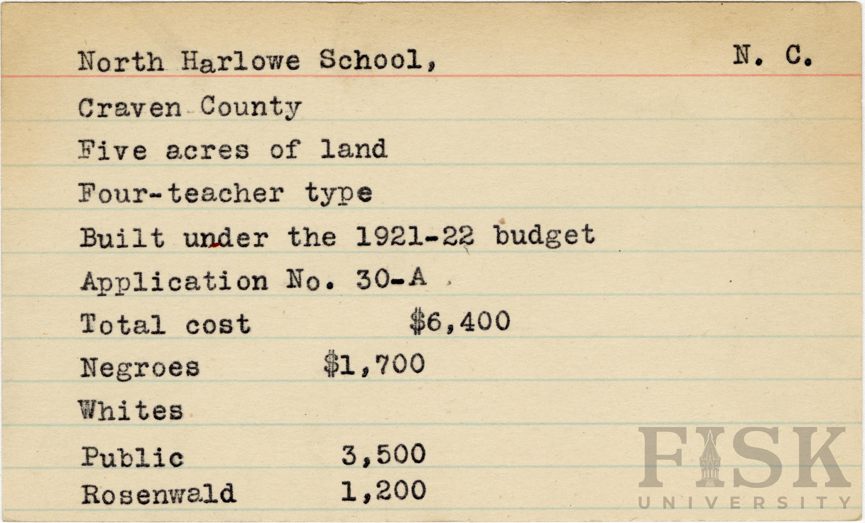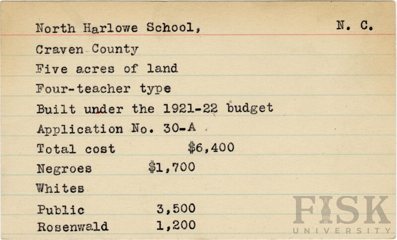 - Julius Rosenwald Fund--Buildings, African American schools--History--20th century, African American schools--North Harlowe School