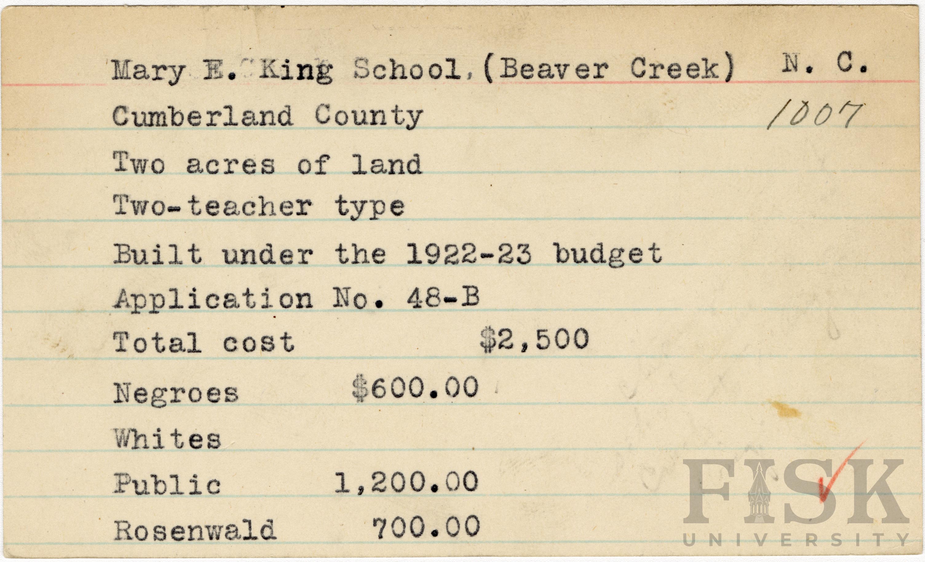 - School card for Mary E. King School in Cumberland County, North Carolina