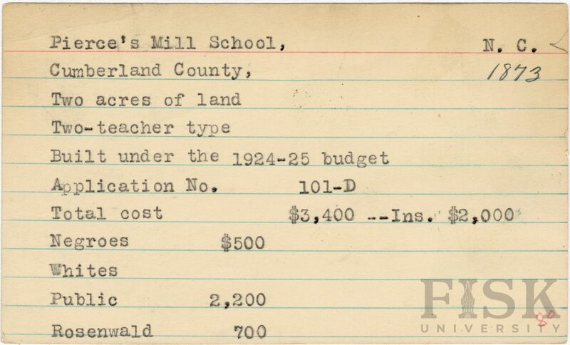 - Julius Rosenwald Fund--Buildings, African American schools--History--20th century, African American schools--Pierce's Mill School