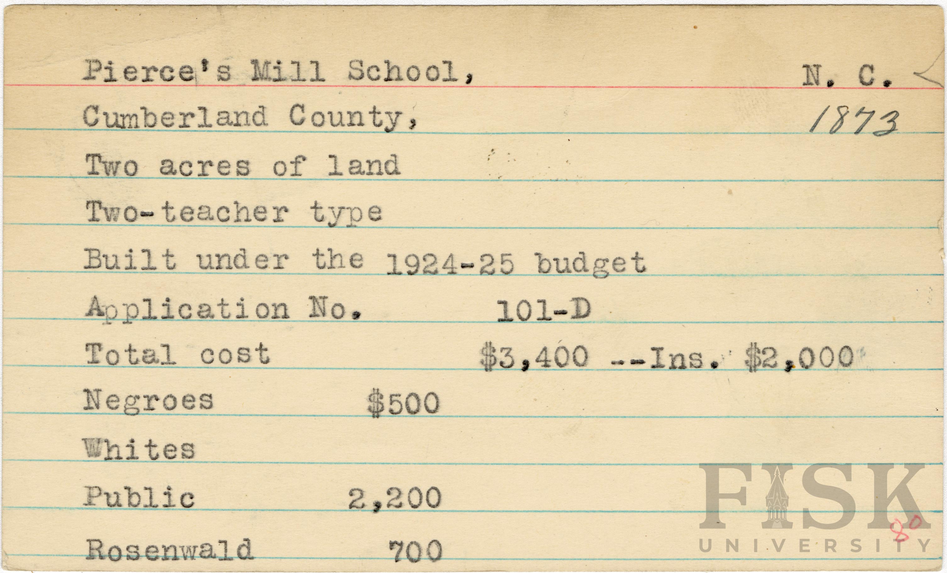 - School card for Pierce's Mill School in Cumberland County, North Carolina with a section added to the budget contributions that says, "Ins. $2,000"