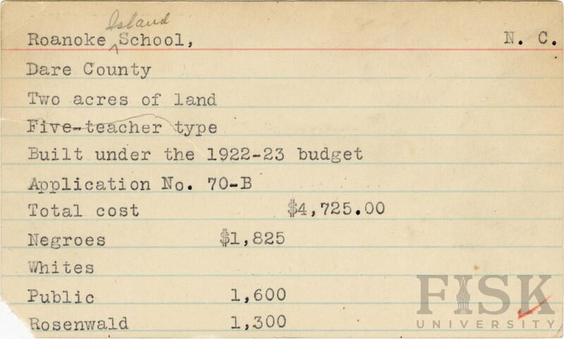 - Julius Rosenwald Fund--Buildings, African American schools--History--20th century, African American schools--Roanoke Island School