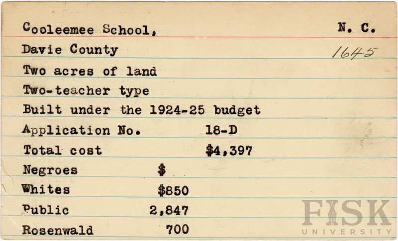 - Julius Rosenwald Fund--Buildings, African American schools--History--20th century, African American schools--Cooleemee School