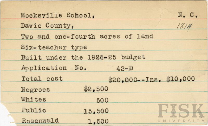 - Julius Rosenwald Fund--Buildings, African American schools--History--20th century, African American schools--Mocksville School