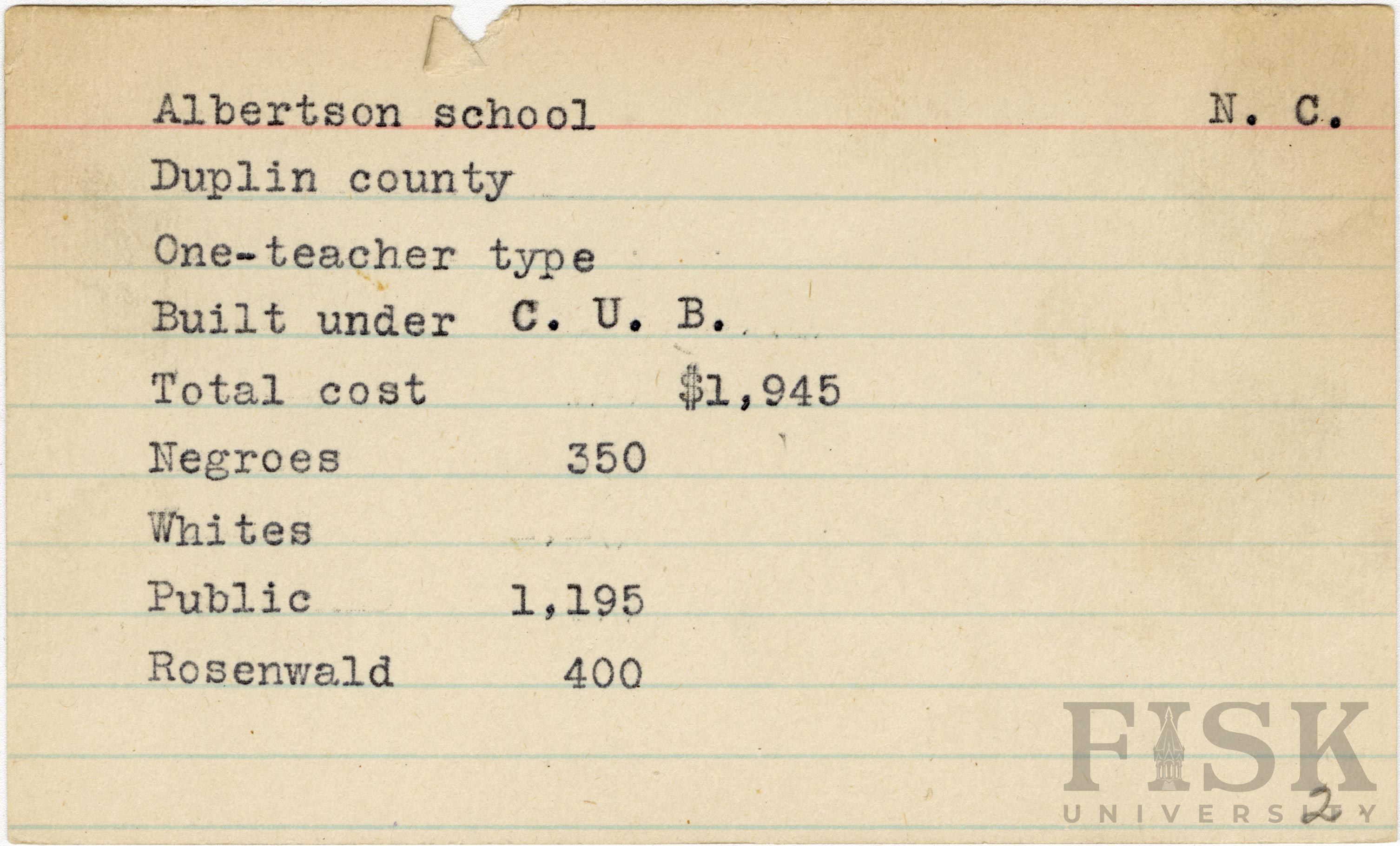 - Julius Rosenwald Fund--Buildings, African American schools--History--20th century, African American schools--Albertson School
