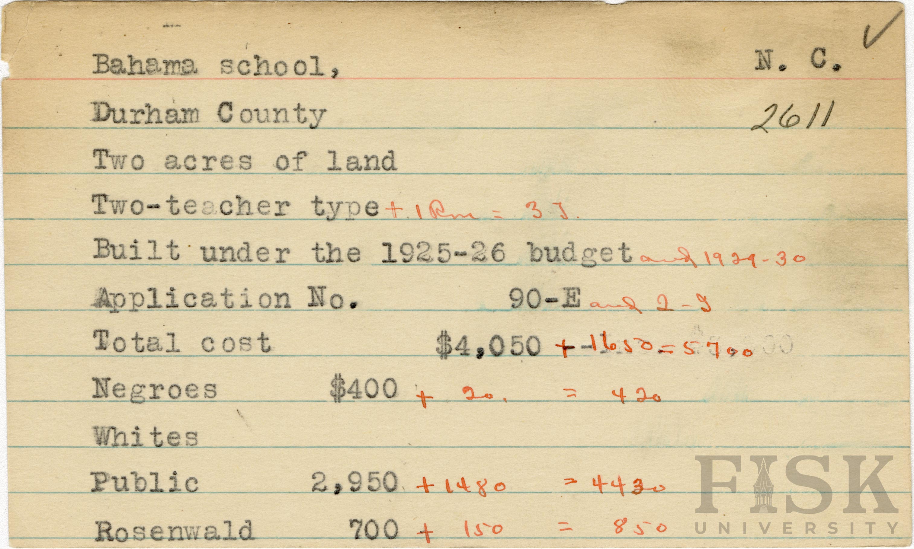 - School card for Bahama School in Durham County, North Carolina with handwritten additions to the teacher type, budget year, application number, and budget contribution sections.