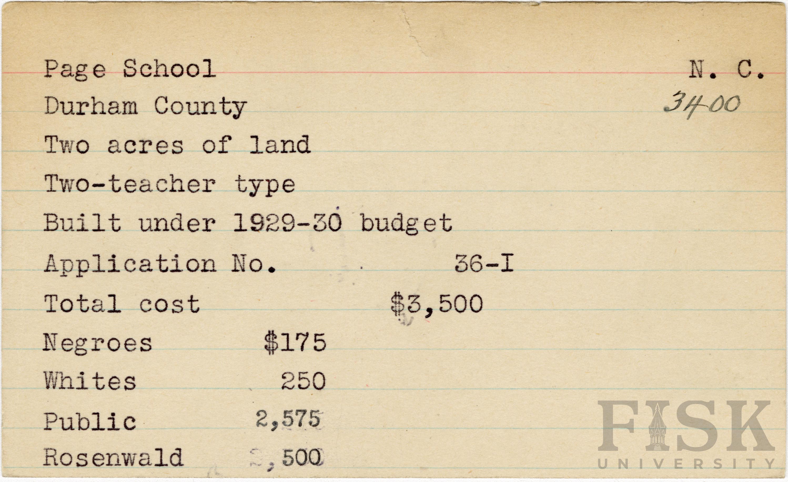 School card for Page School in Durham County, North Carolina