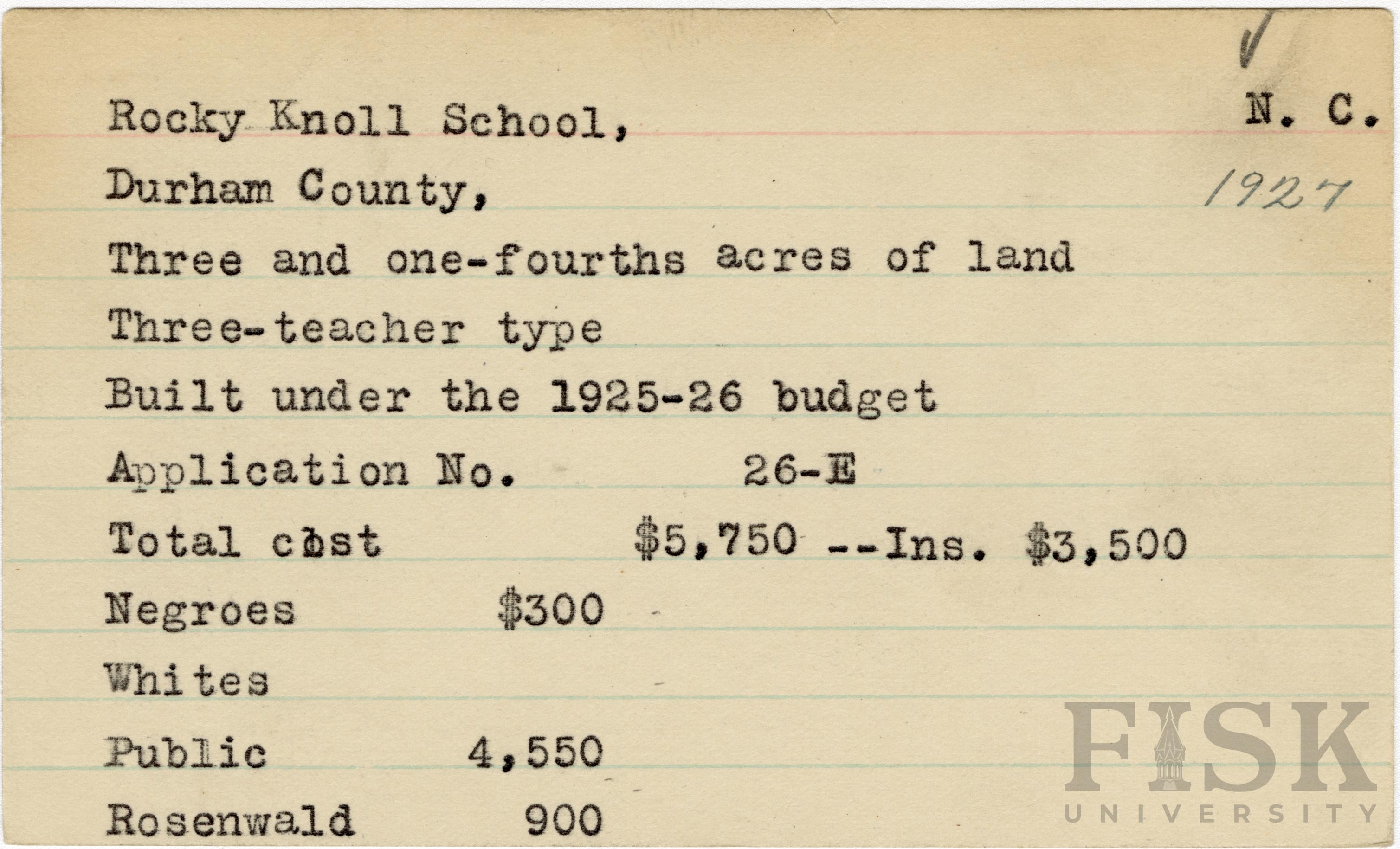 School card for Rocky Knoll School in Durham County, North Carolina with a section added to the budget contributions that says, "Ins. $3,500"