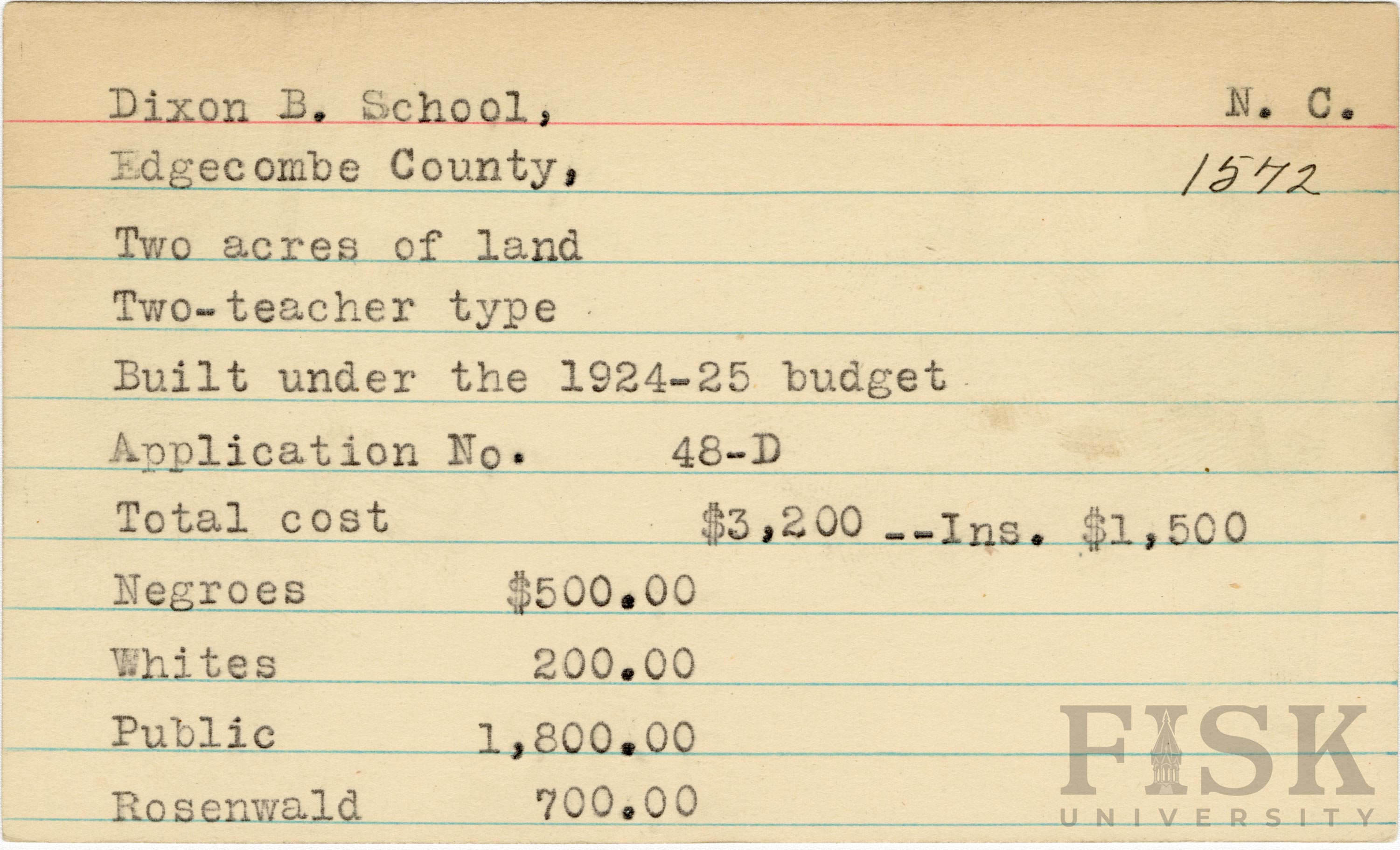 School card for Dixon B. School in Edgecombe County, North Carolina with a section added to the budget contributions that says, "Ins. $1,500"