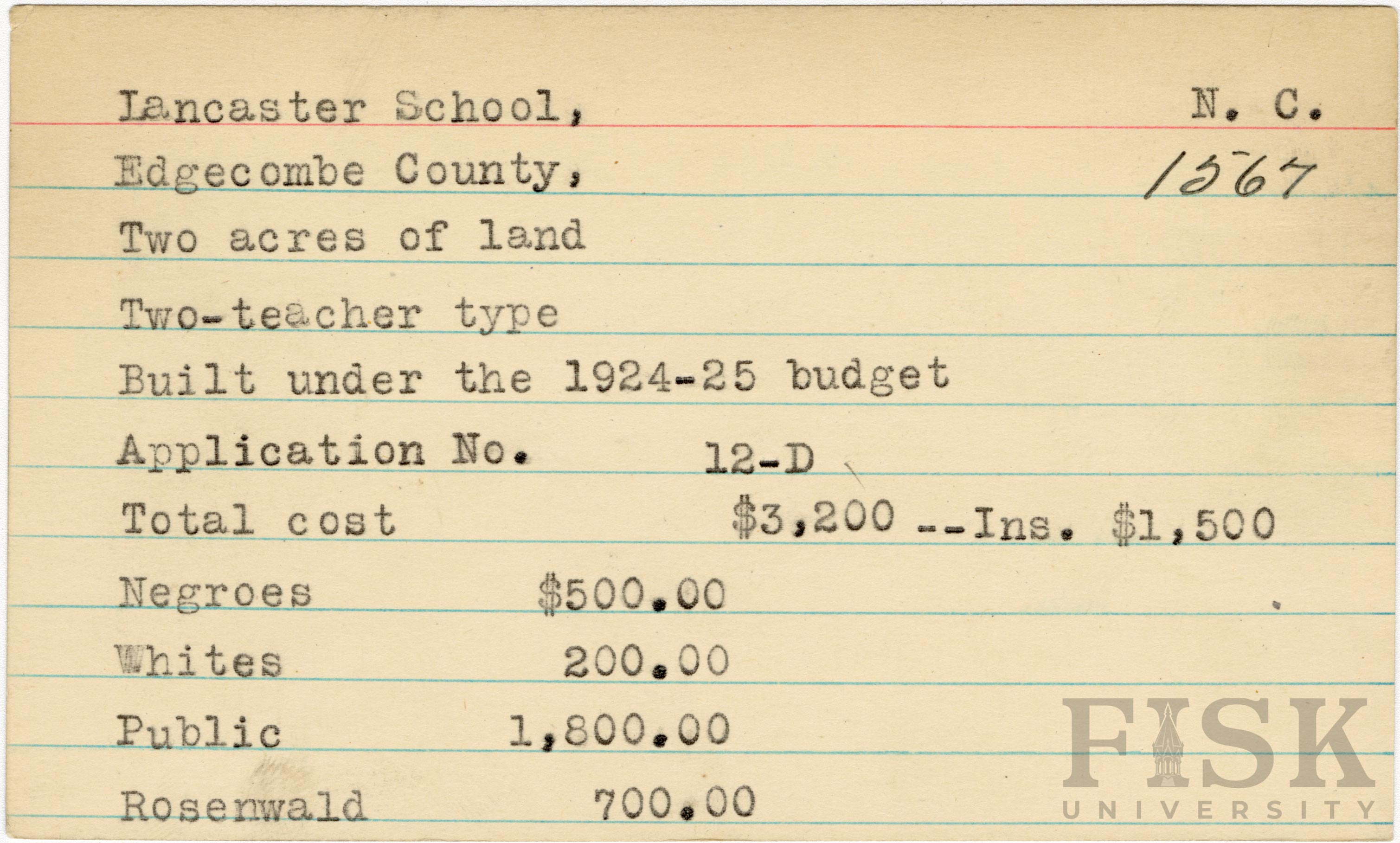 - School card for Lancaster School in Edgecombe County, North Carolina with a section added to the budget contributions that says, "Ins. $1,500"