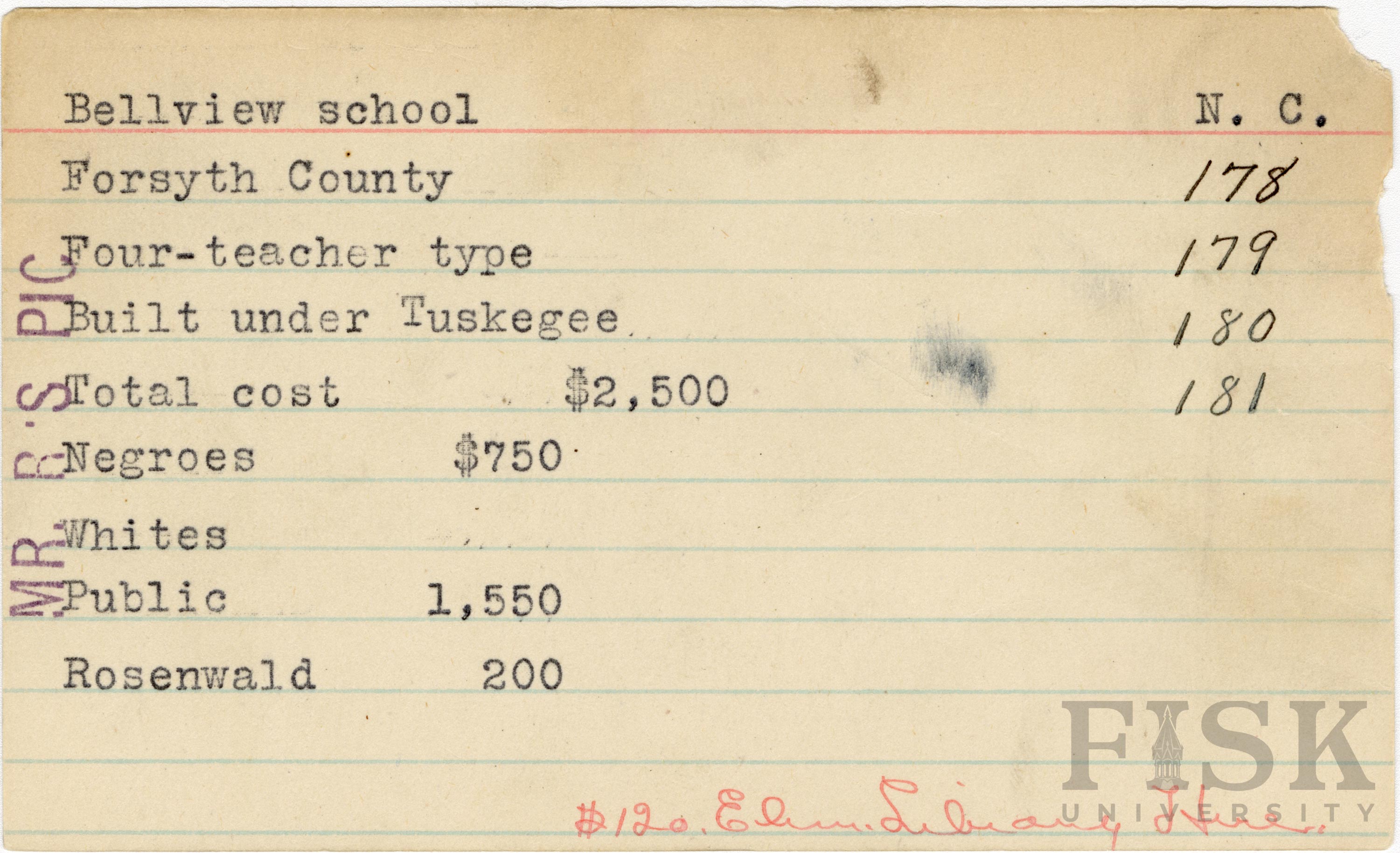 School card for Bellview School in Forsyth County, North Carolina with a note on the far left of the card that says, "Mr. R's Pic". A handwritten note on the card says, "$120 elem library here"