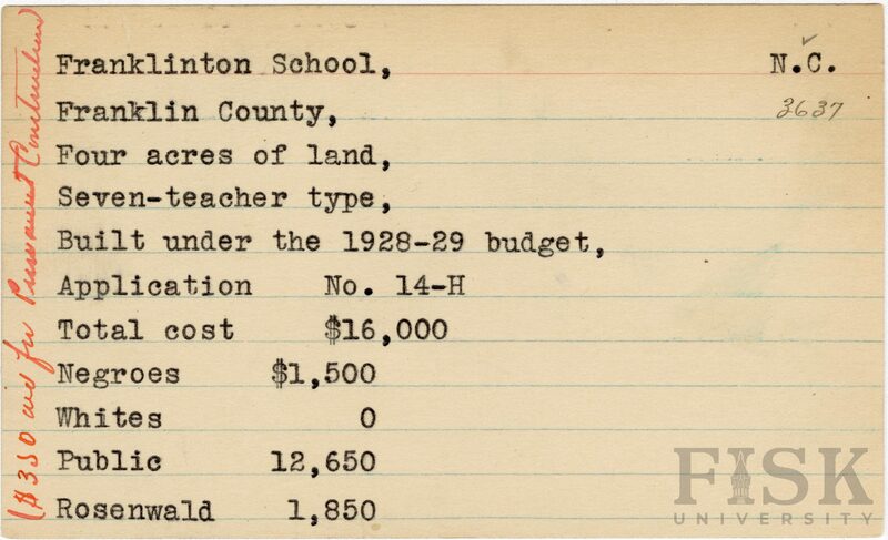 - School card for Franklinton School in Franklin County, North Carolina with a handwritten note on the far left of the card that says, "($350 aid for permanent construction)"