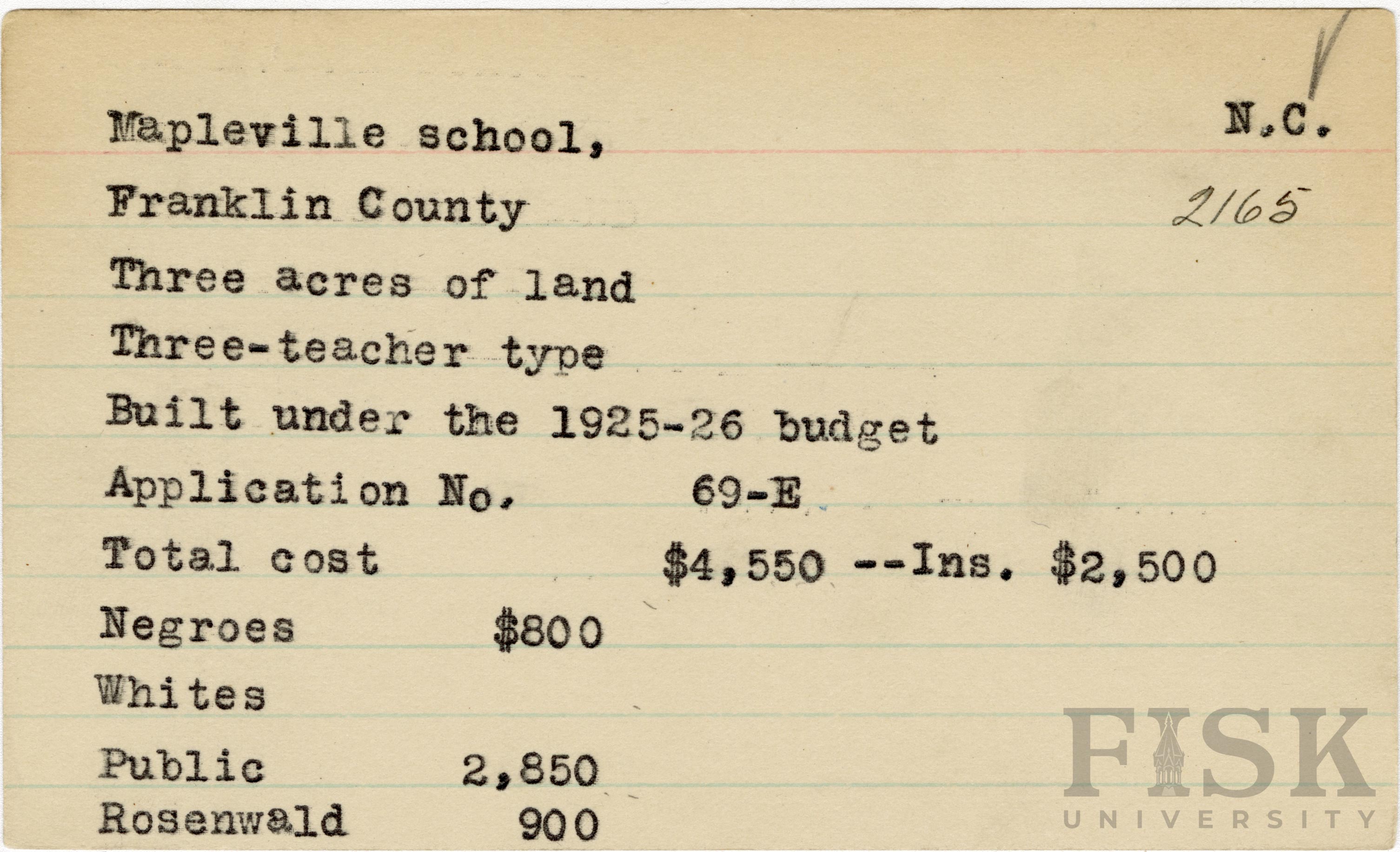 - School card for Mapleville School in Franklin County, North Carolina with a section added to the budget contributions that says, "Ins. $2,500"