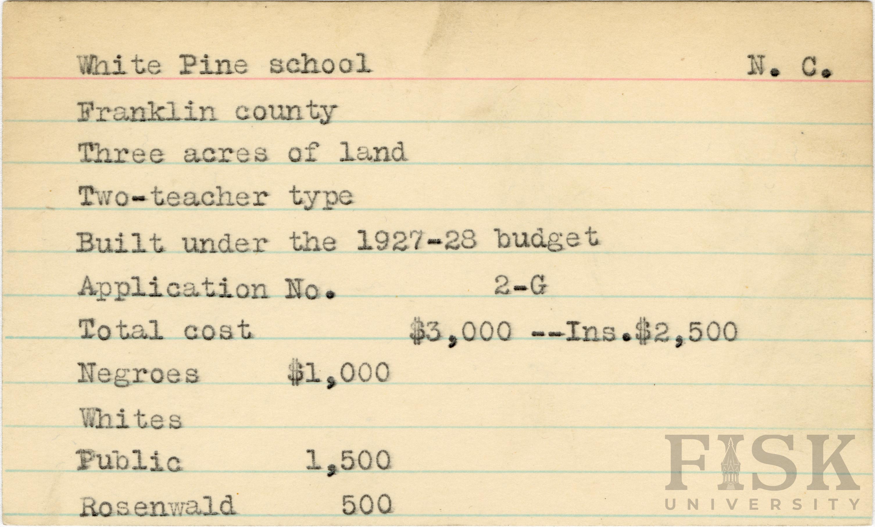 - School card for White Pine School in Franklin County, North Carolina with a section added to the budget contributions that says, "Ins. $2,500"