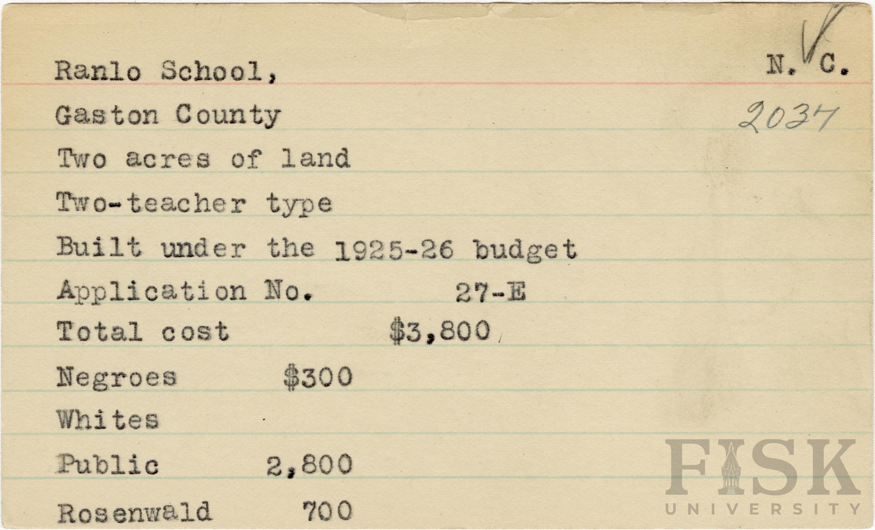- Julius Rosenwald Fund--Buildings, African American schools--History--20th century, African American schools--Ranlo School