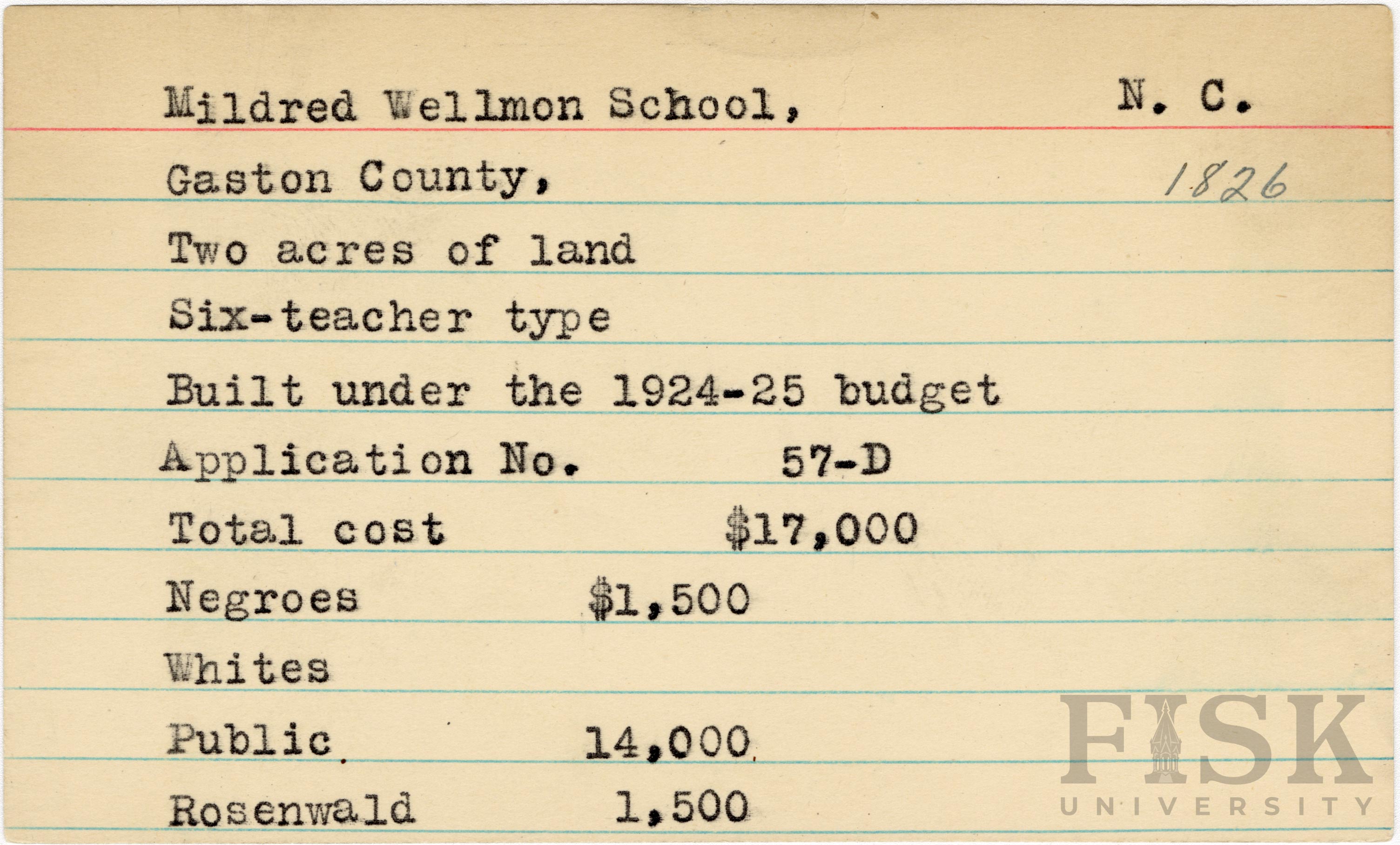 School card for Mildred Wellmon School in Gaston County, North Carolina