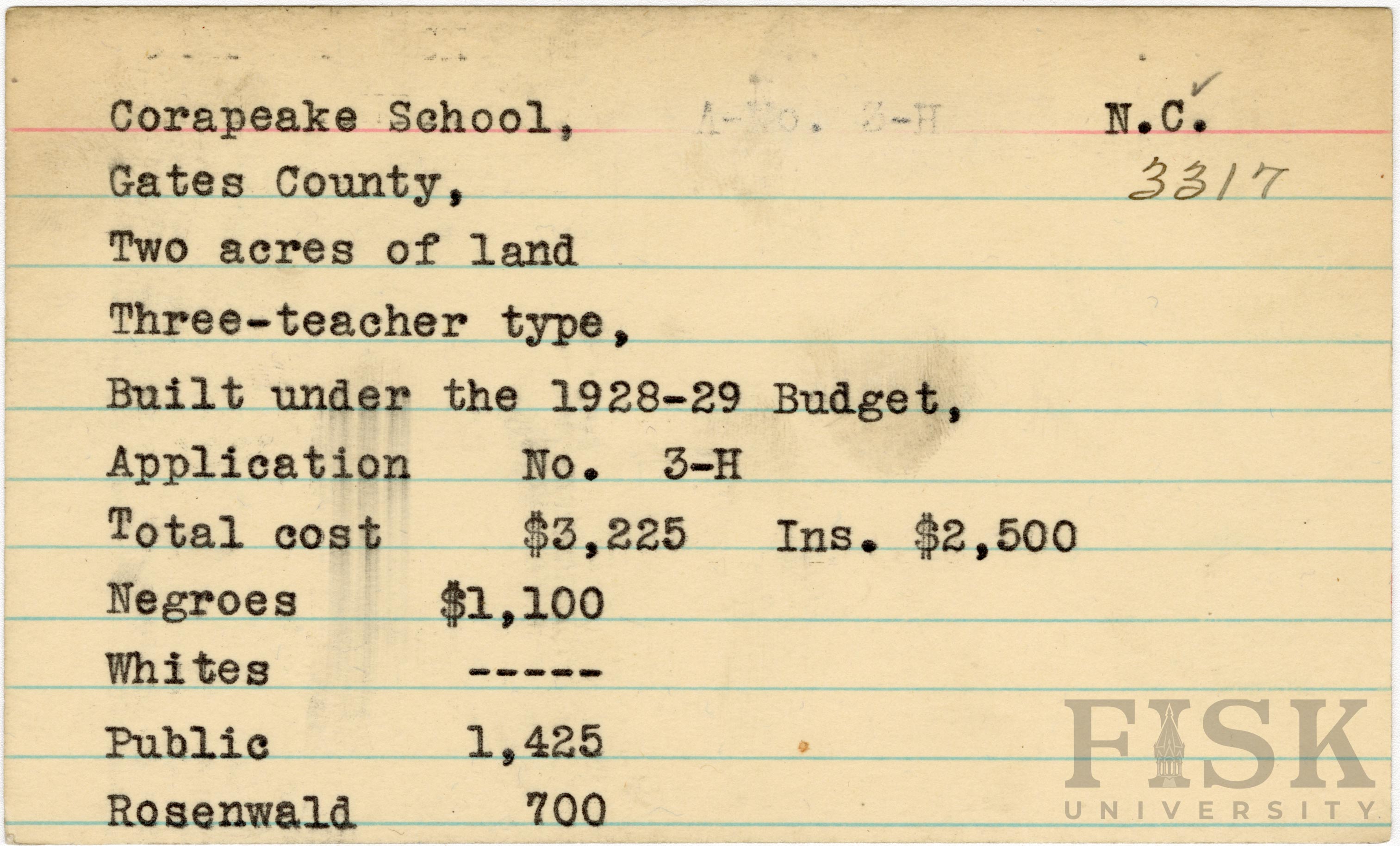 - Julius Rosenwald Fund--Buildings, African American schools--History--20th century, African American schools--Corapeake School