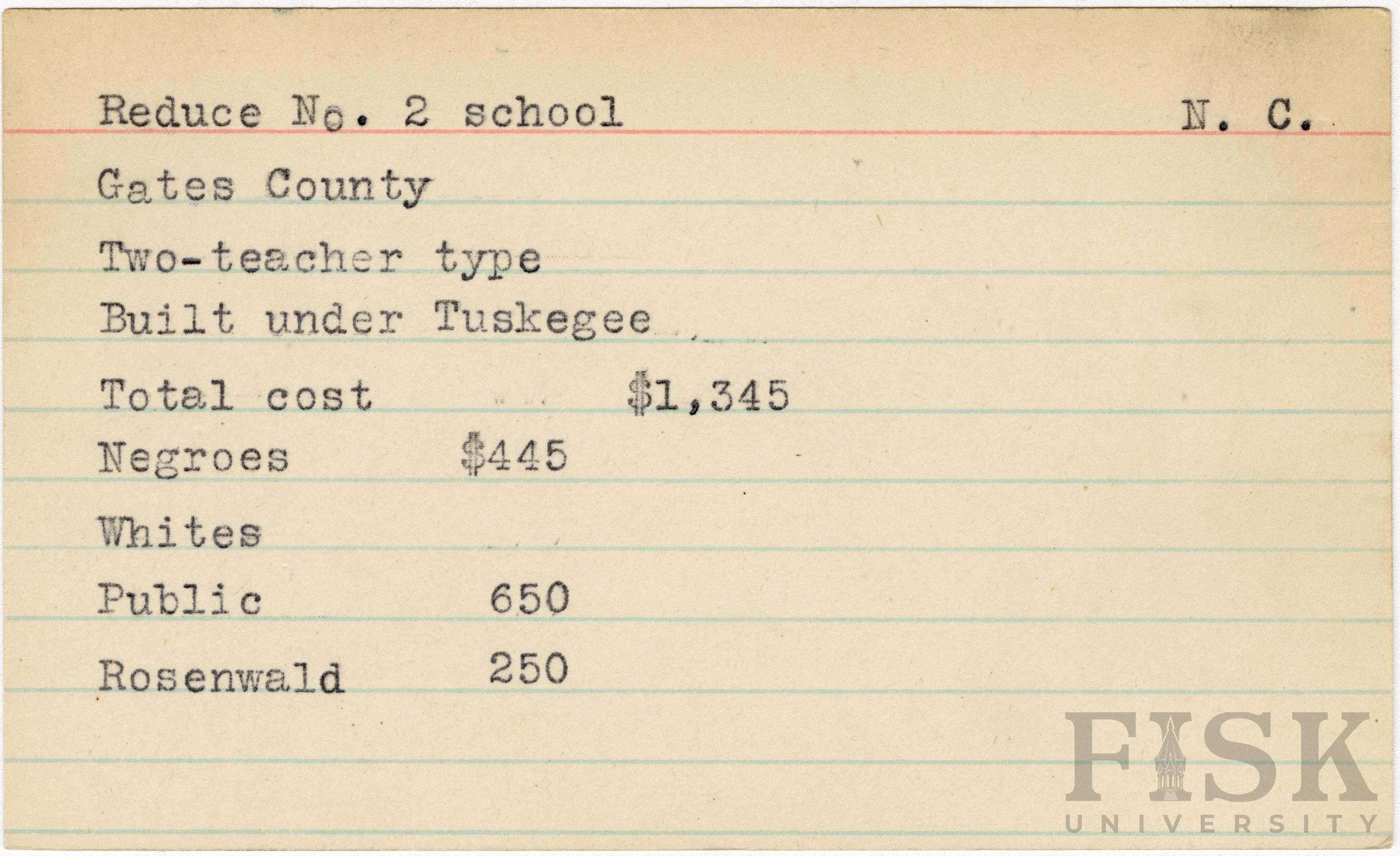 - Julius Rosenwald Fund--Buildings, African American schools--History--20th century, African American schools--Reduce No. 2 School