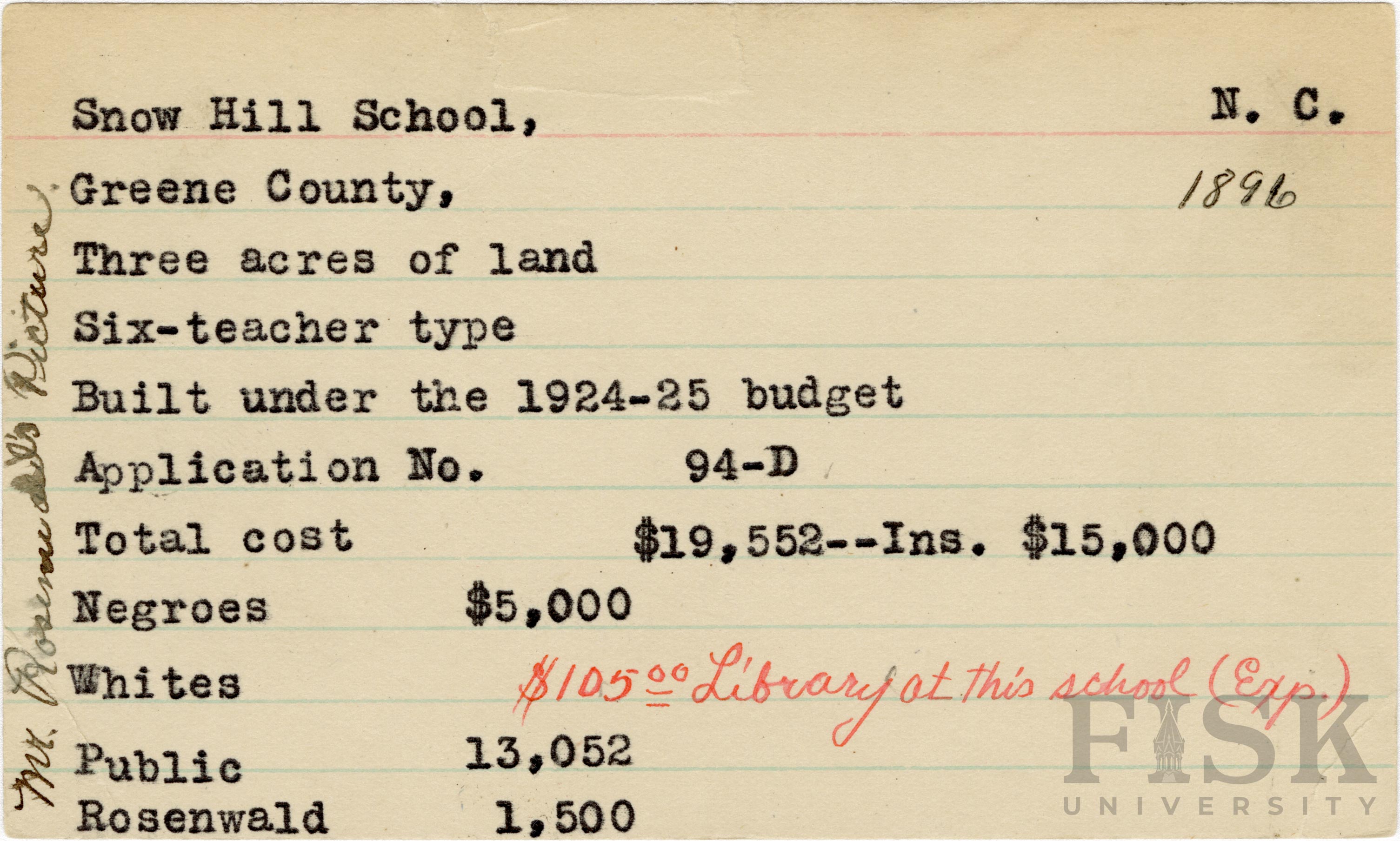 - School card for Snow Hill School in Greene County, North Carolina with handwritten notes on the card that say, "Mr. Rosenwald's Picture" and "$105.00 library at this school (Exp)"