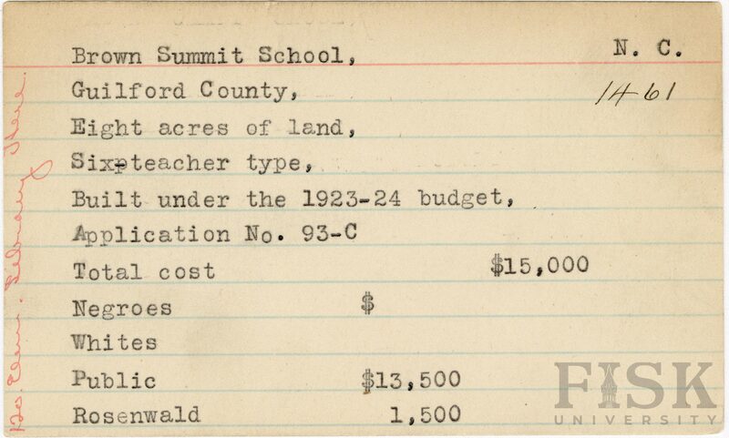 - School card for Brown Summit School in Guilford County, North Carolina with a handwritten note on the far left of the card that says, "120 elem library here"