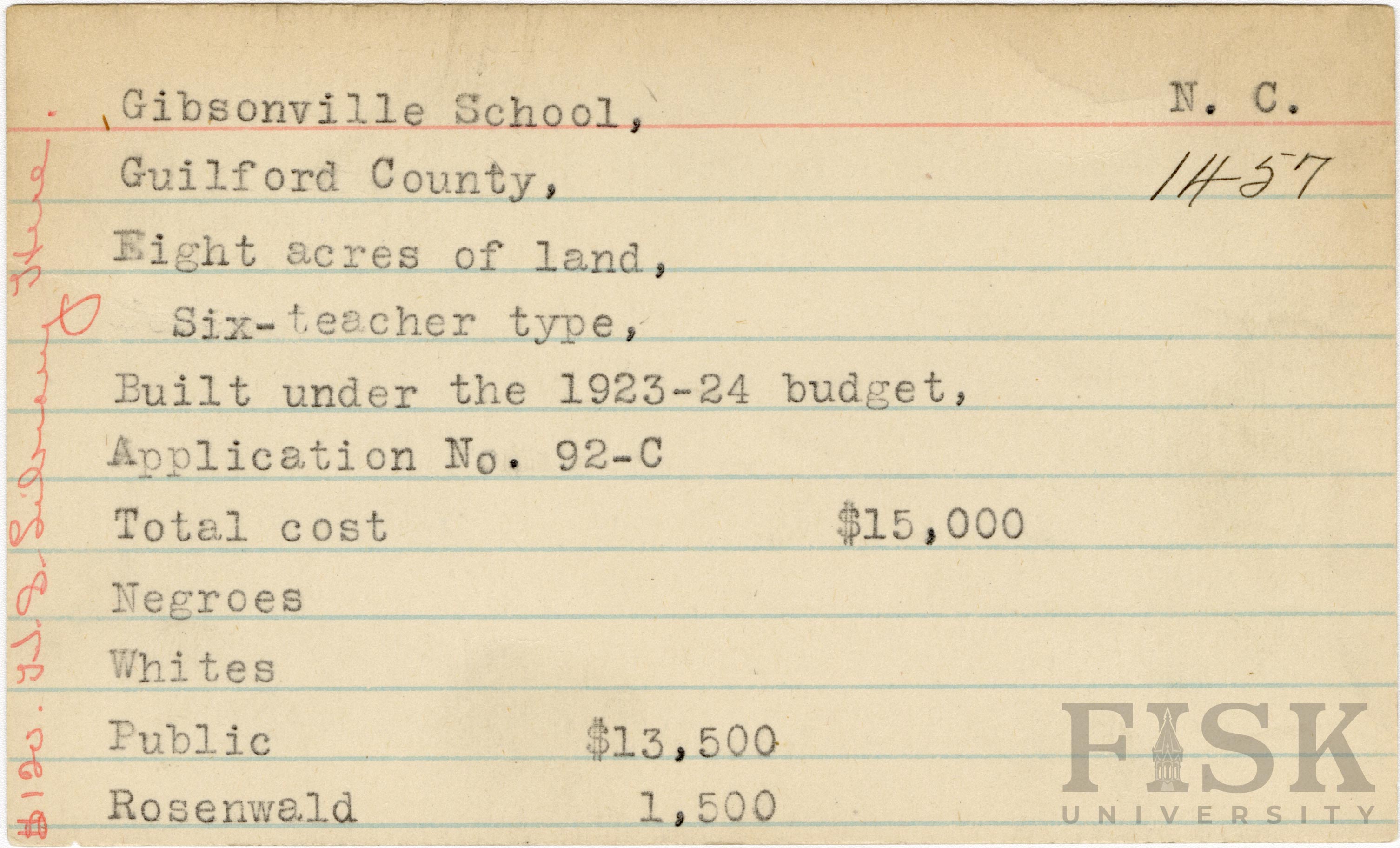 - School card for Gibsonville School in Guilford County, North Carolina with a handwritten note on the far left of the card that says, "$120 H.S. library here"