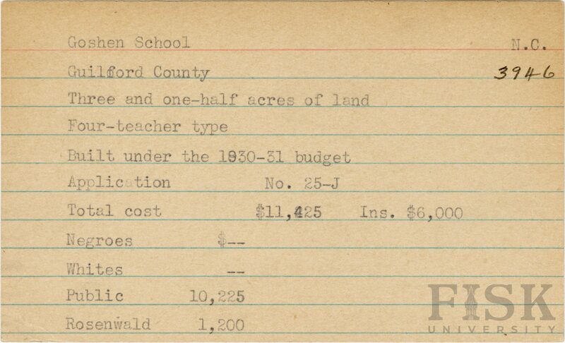 - Julius Rosenwald Fund--Buildings, African American schools--History--20th century, African American schools--Goshen School