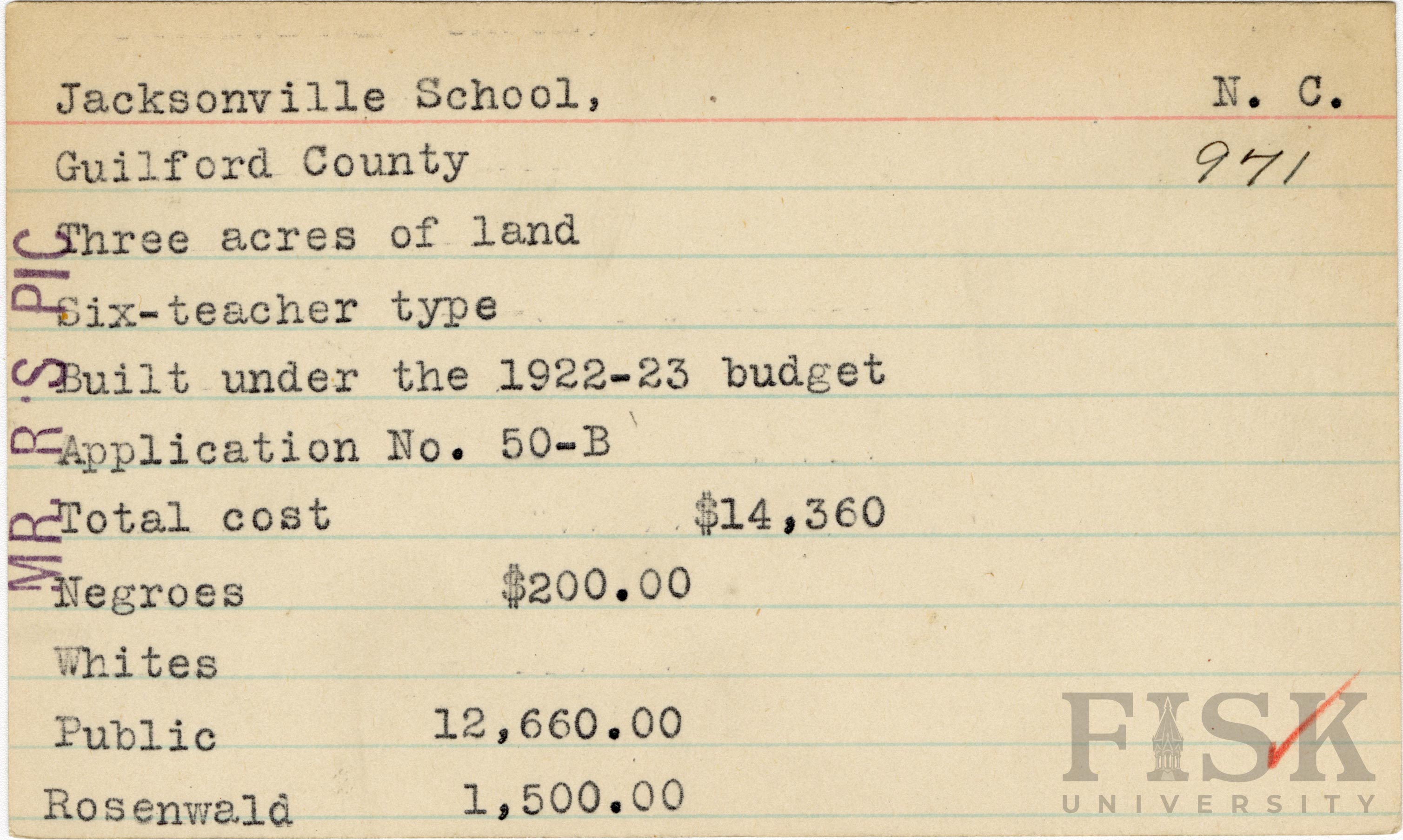 School card for Jacksonville School in Guilford County, North Carolina with a note on the far left of the card that says, "Mr. R's Pic"