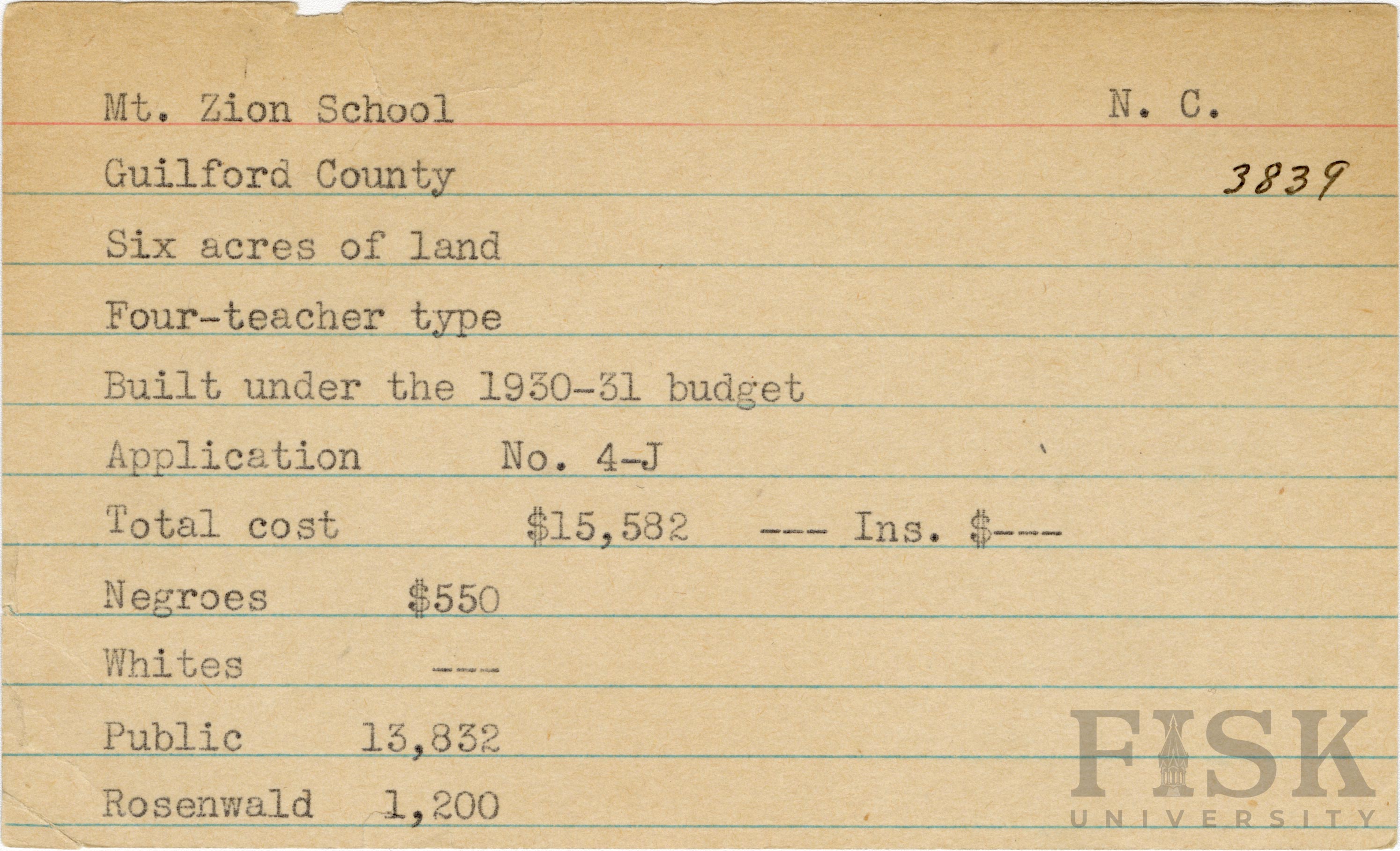 School card for Mt. Zion School in Guilford County, North Carolina