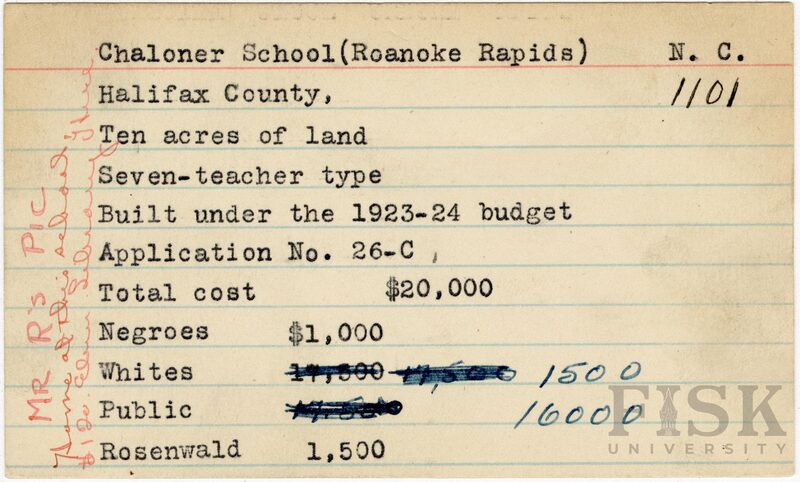 School card for Chaloner School in Halifax County, North Carolina with handwritten notes on the far left of the card that say, "Mr. R's Pic," "Home at this school," and "$120 elem library here"