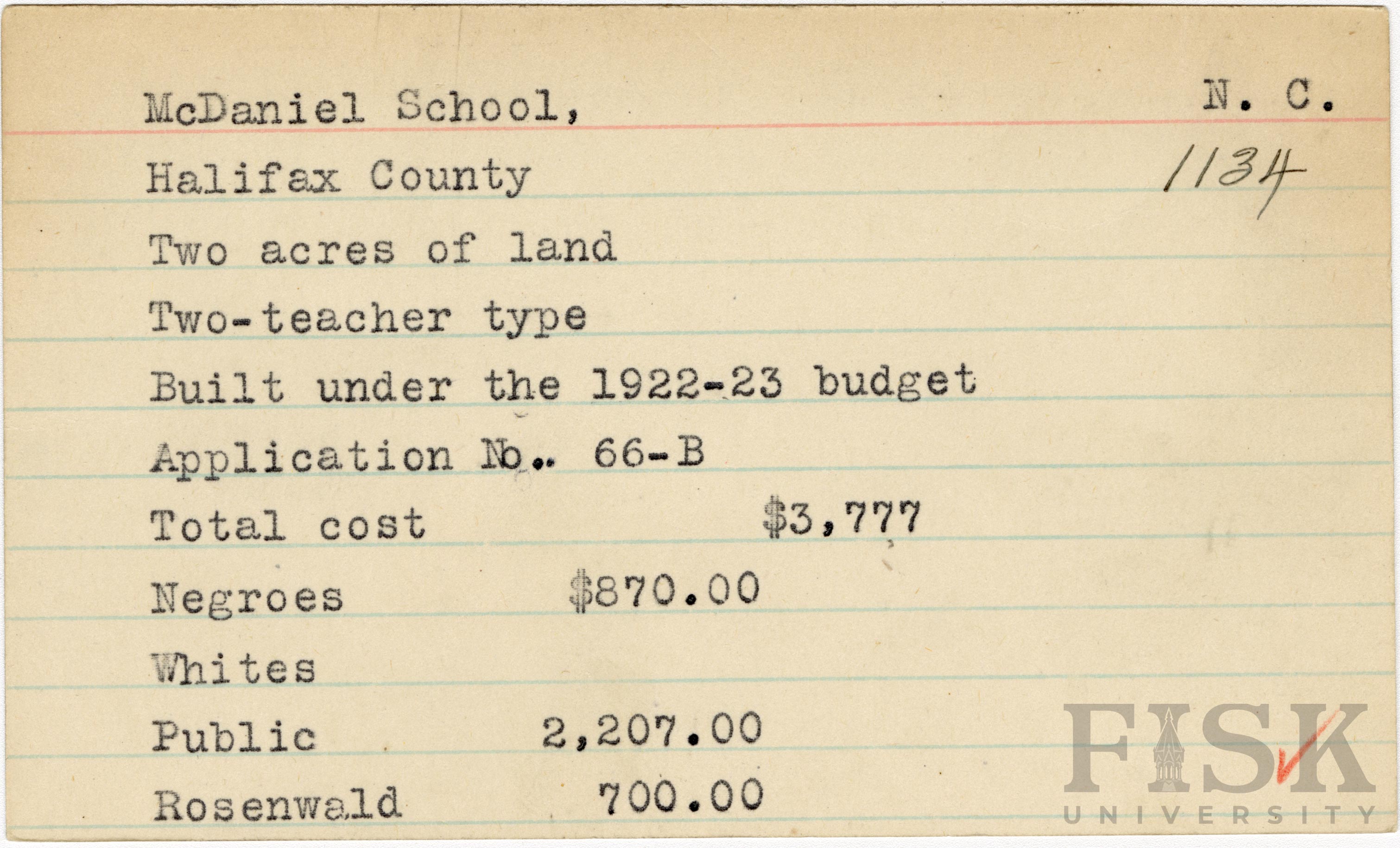 - School card from Rosenald Fund for McDaniel School in Halifax County, North Carolina