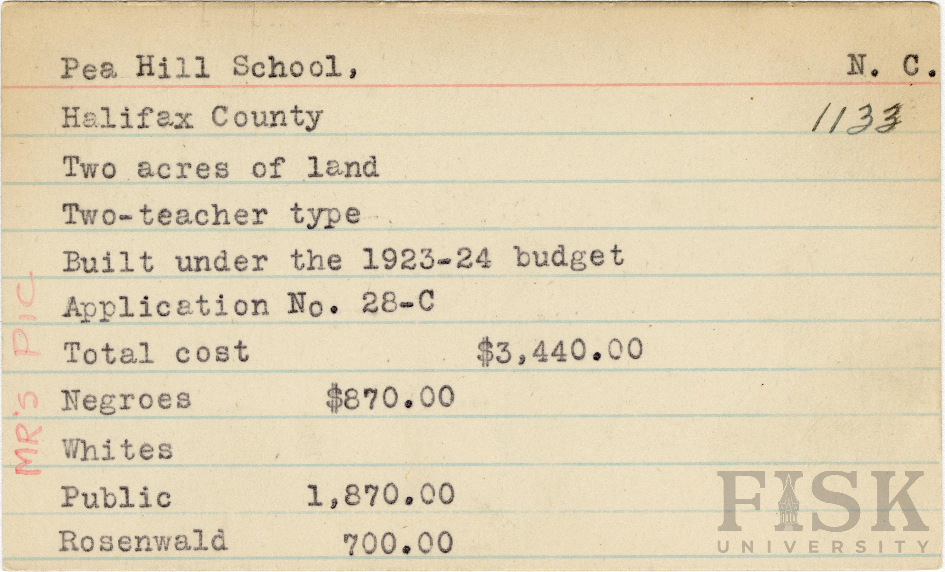 School card for Pea Hill School in Halifax County, North Carolina with a handwritten note on the far left of the card that says, "Mr's Pic"