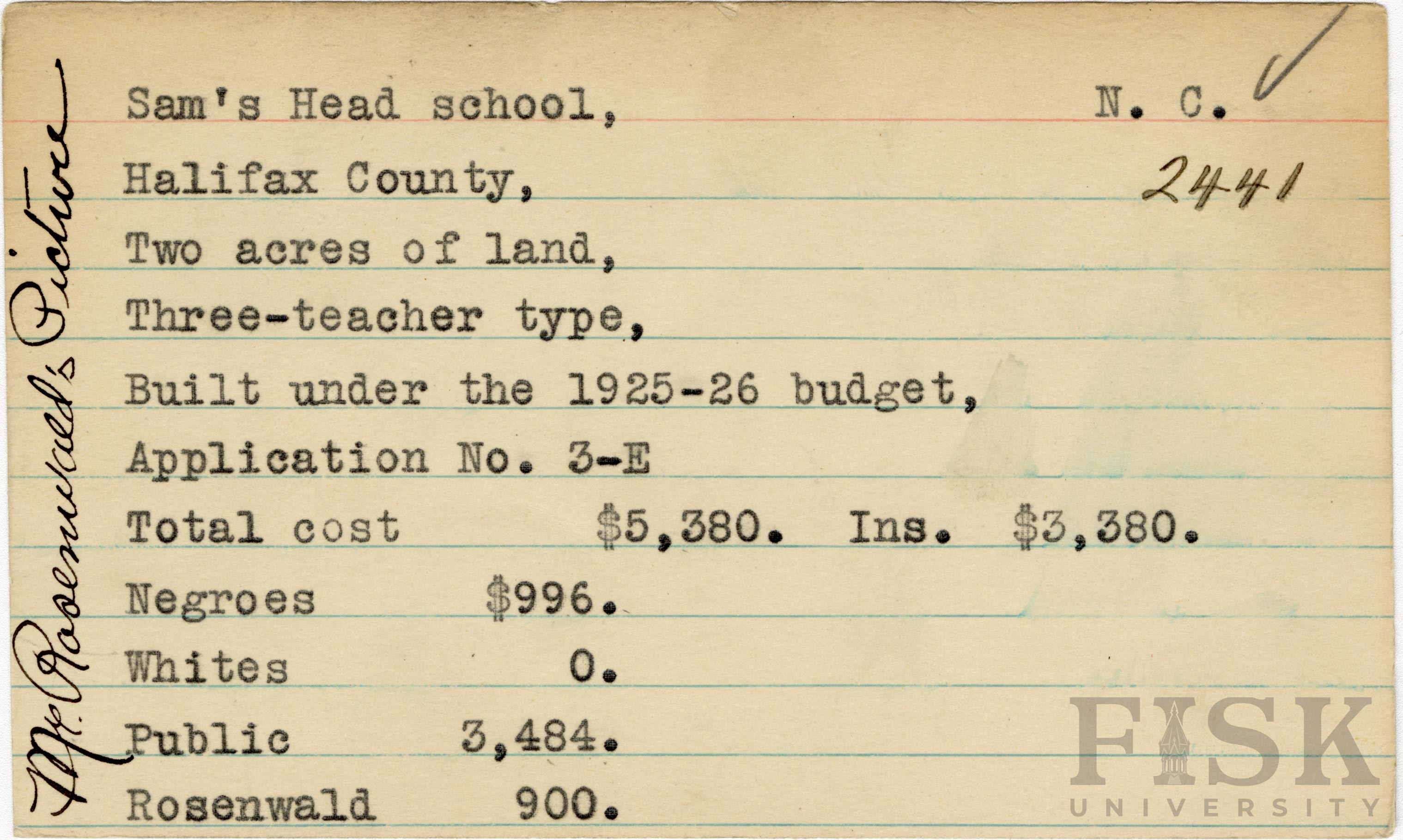 - School card for Sam's Head School in Halifax County, North Carolina with a section added to the budget contributions that says, "Ins. $3,380" and a handwritten note on the far left of the card that says, "Mr. Rosenwald's Picture"