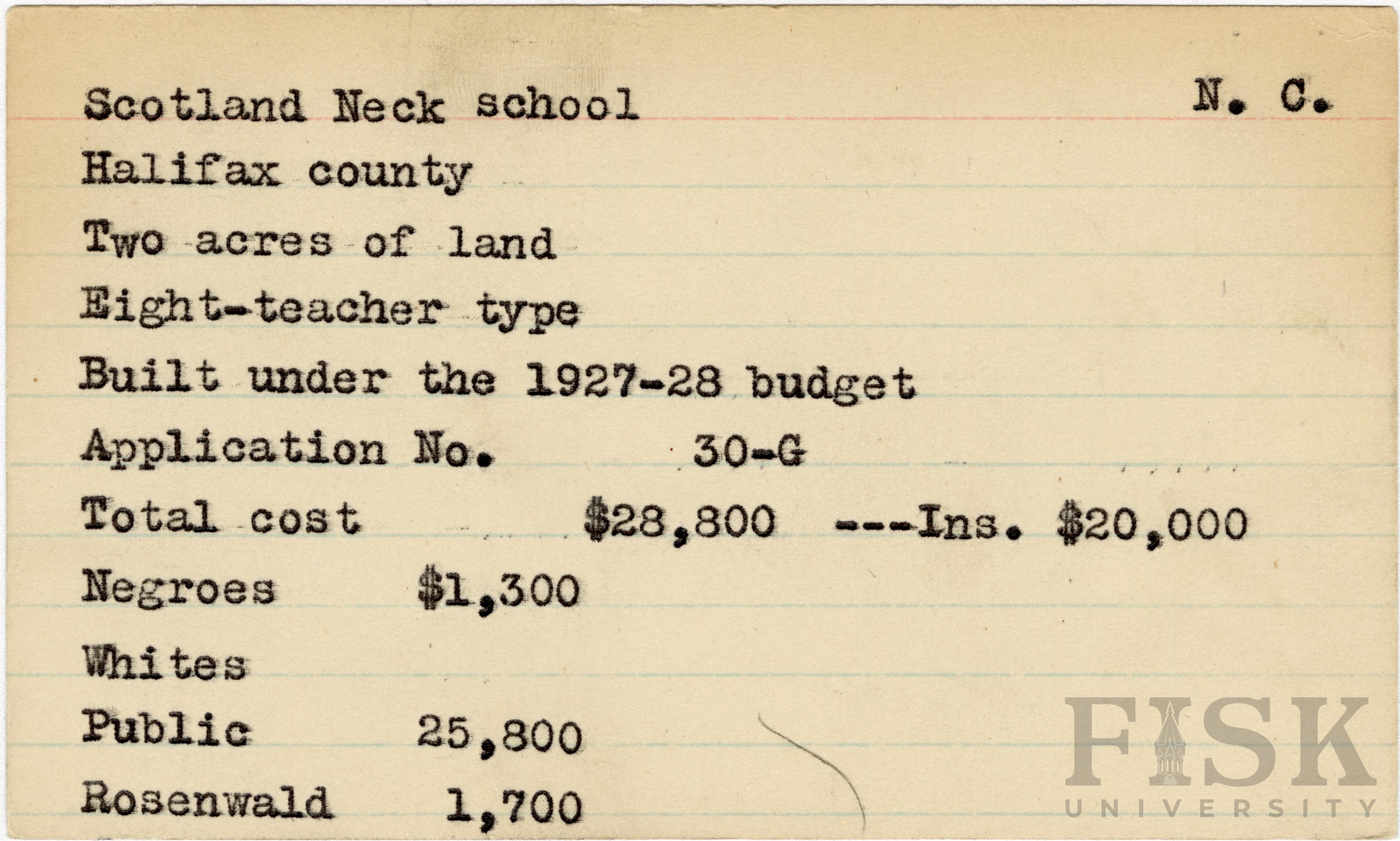 - School card for Scotland Neck School in Halifax County, North Carolina with a section added to the budget contributions that says, "Ins. $20,000"