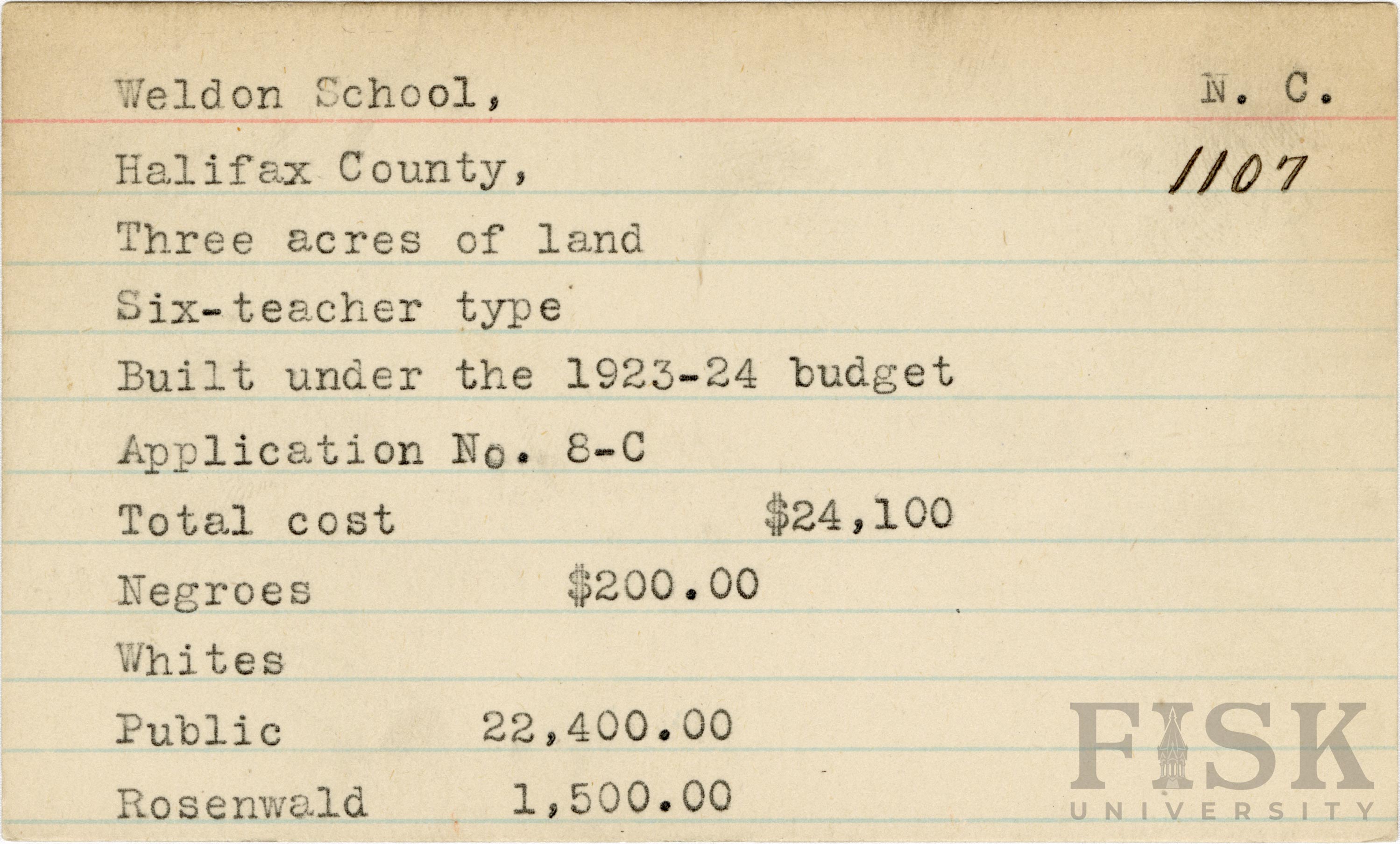 School card for Weldon School in Halifax County, North Carolina
