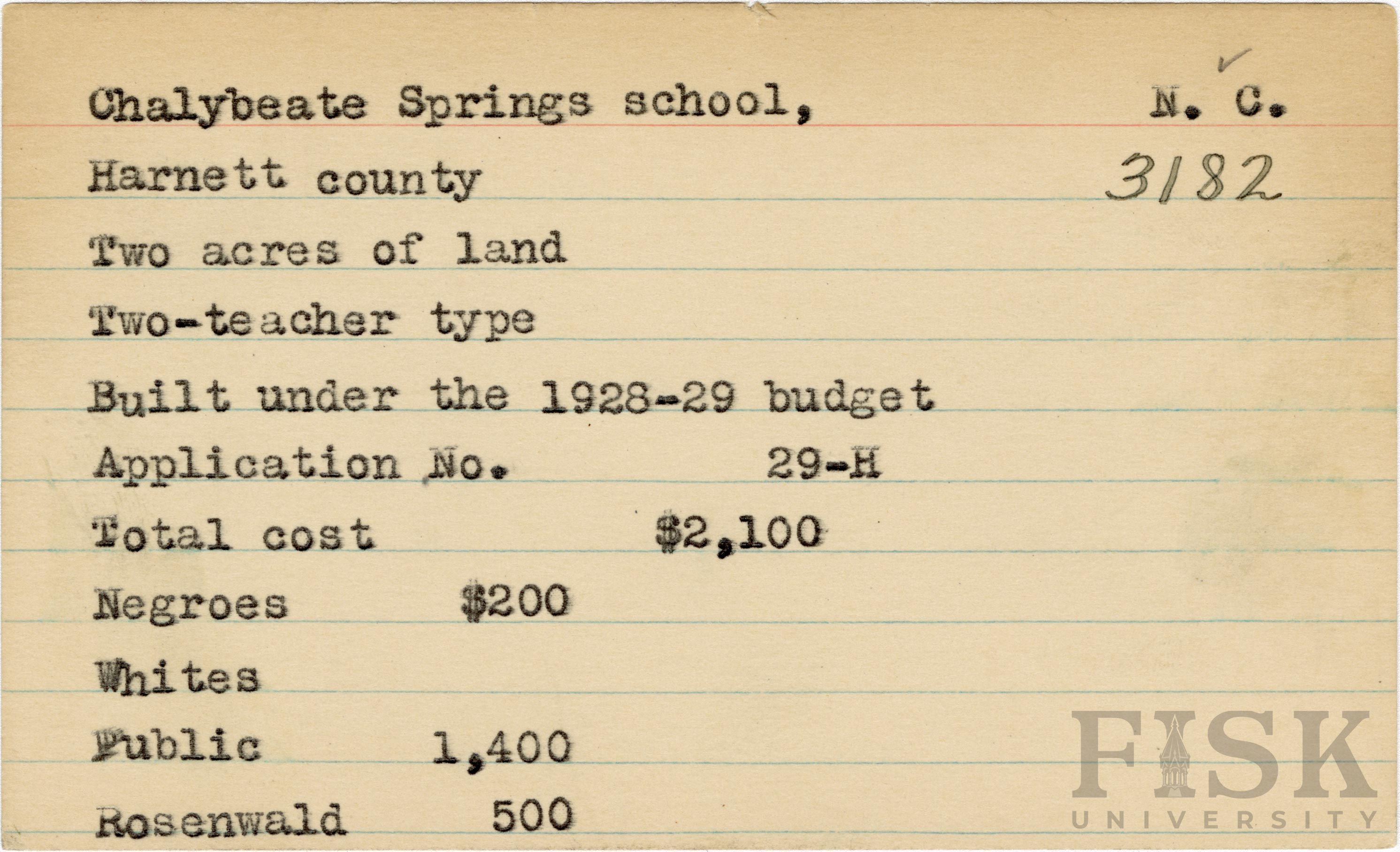 - School card for Chalybeate Springs School in Harnett County, North Carolina