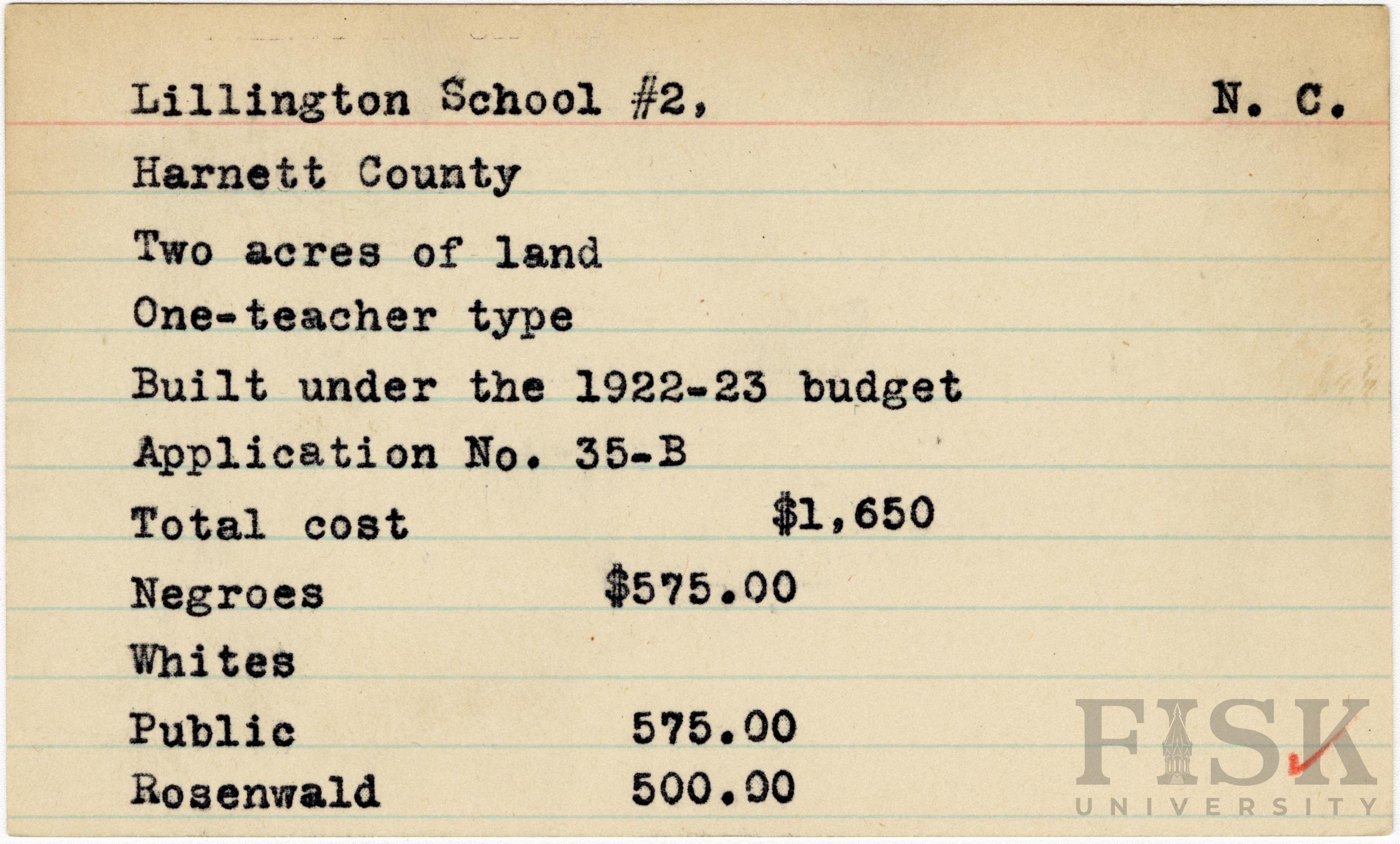 - Julius Rosenwald Fund--Buildings, African American schools--History--20th century, African American schools--Lillington School No. 2
