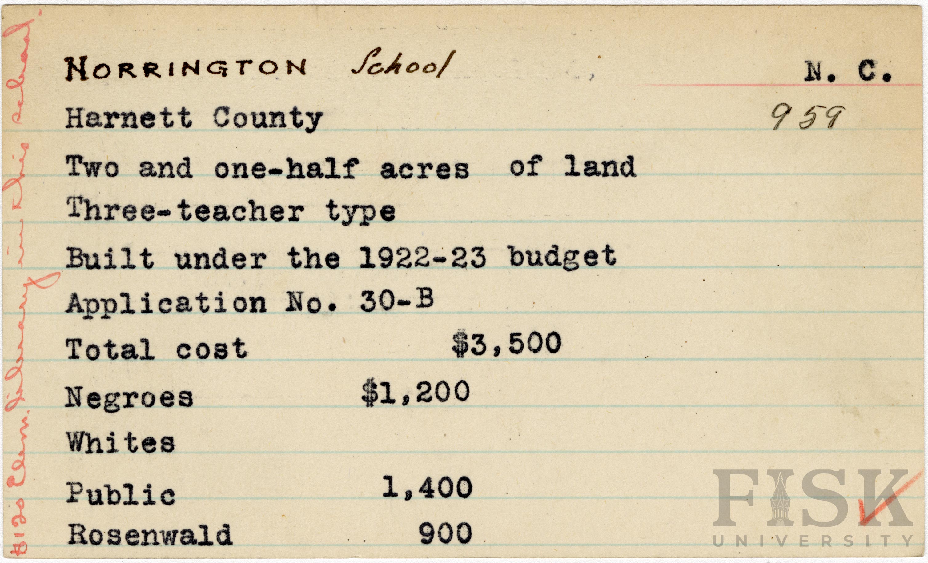 - School card for Norrington School in Harnett County, North Carolina with a handwritten note on the far left of the card that says, "$120 elem library in this school"