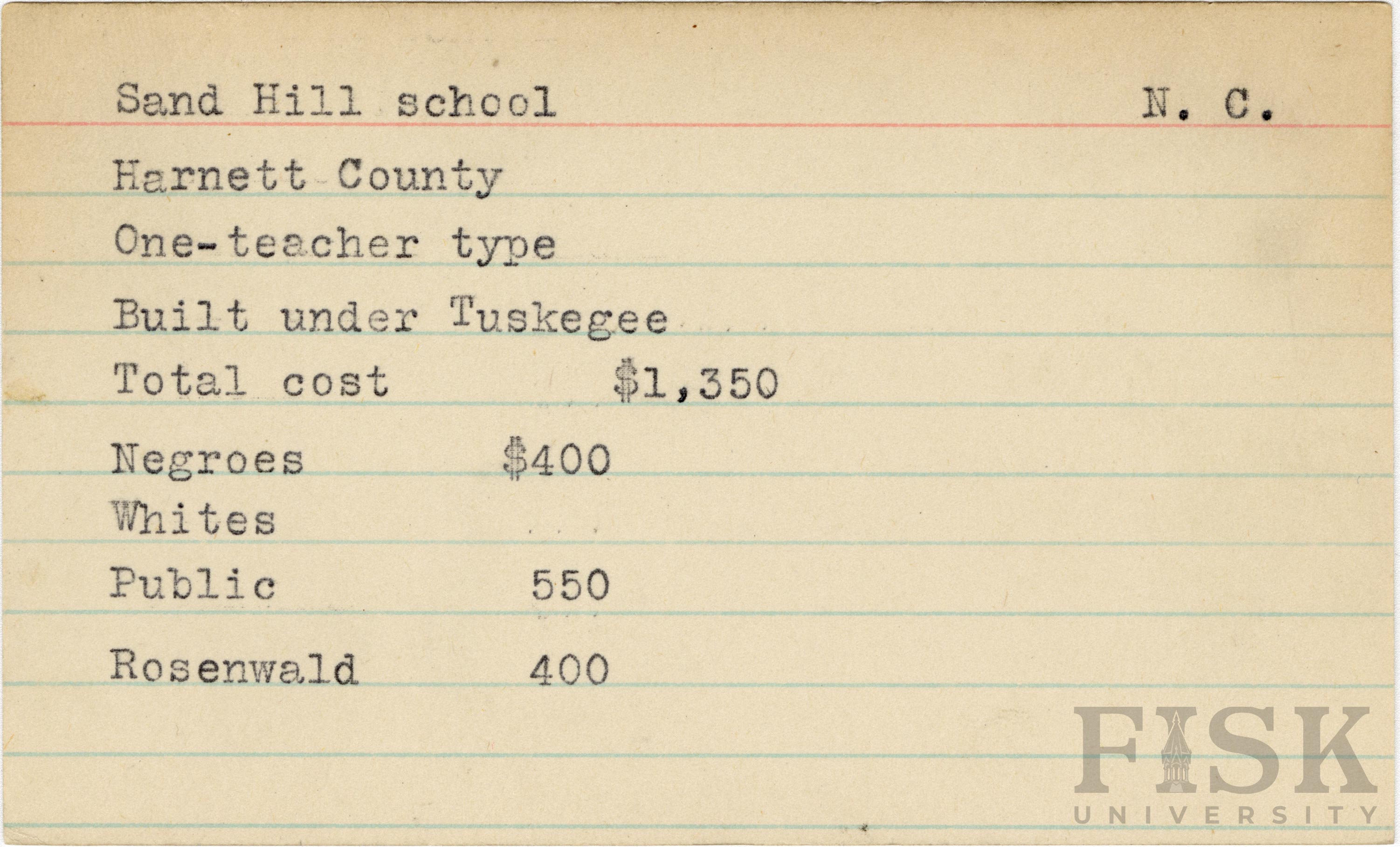 - Julius Rosenwald Fund--Buildings, African American schools--History--20th century, African American schools--Sand Hill School