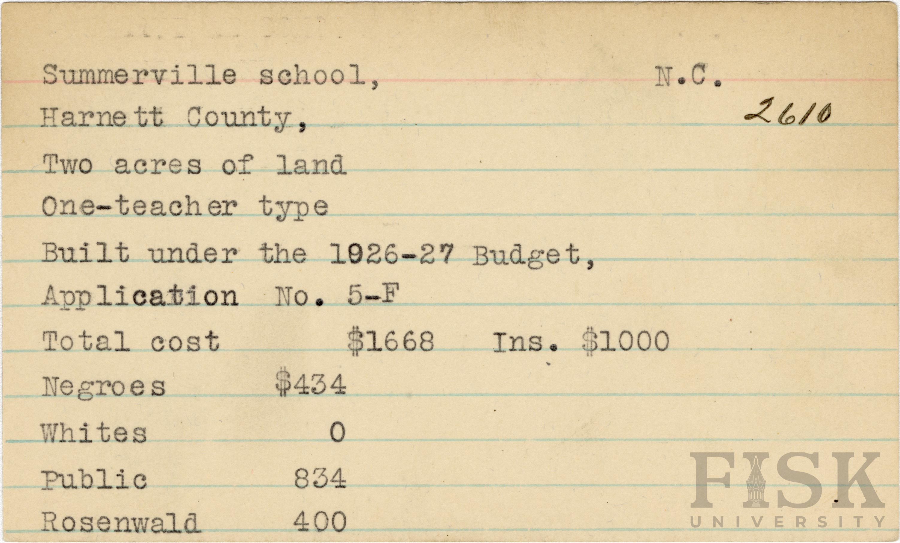 - School card for Summerville School in Harnett County, North Carolina with a section added to the budget contributions that says, "Ins. $1,000"