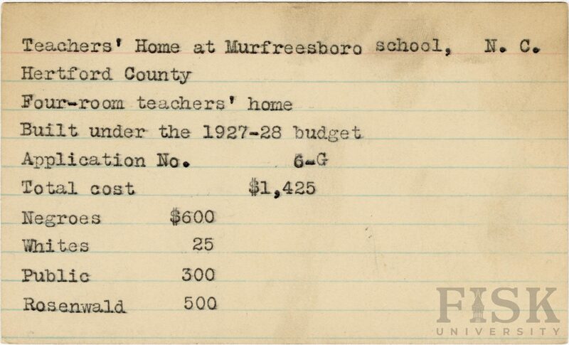- School card for the four room teacher's home at Murfreesboro School in Hertford County, North Carolina with a handwritten note on the far left of the card that says, "home at this school"