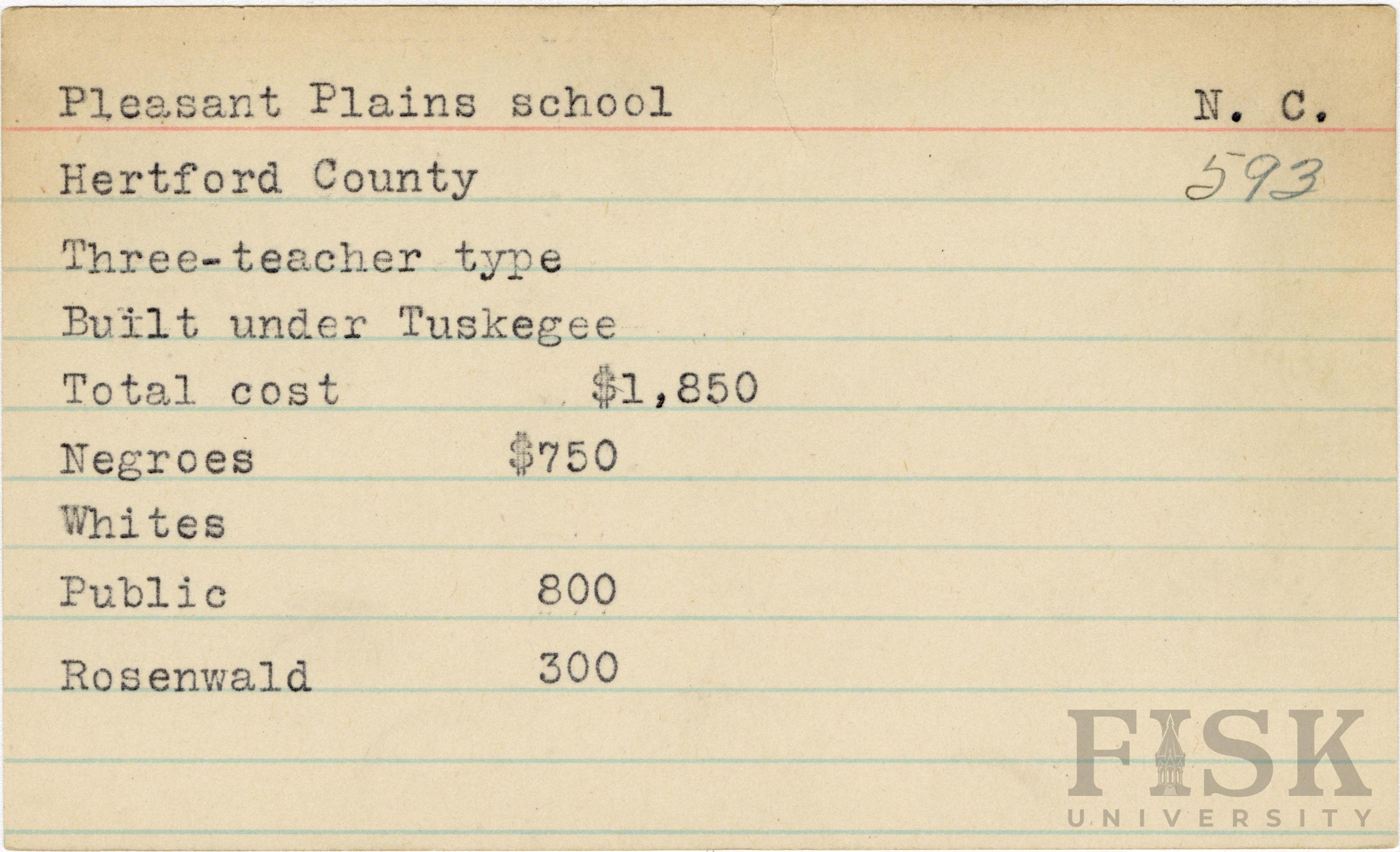 School card for Pleasant Plains School in Hertford County, North Carolina