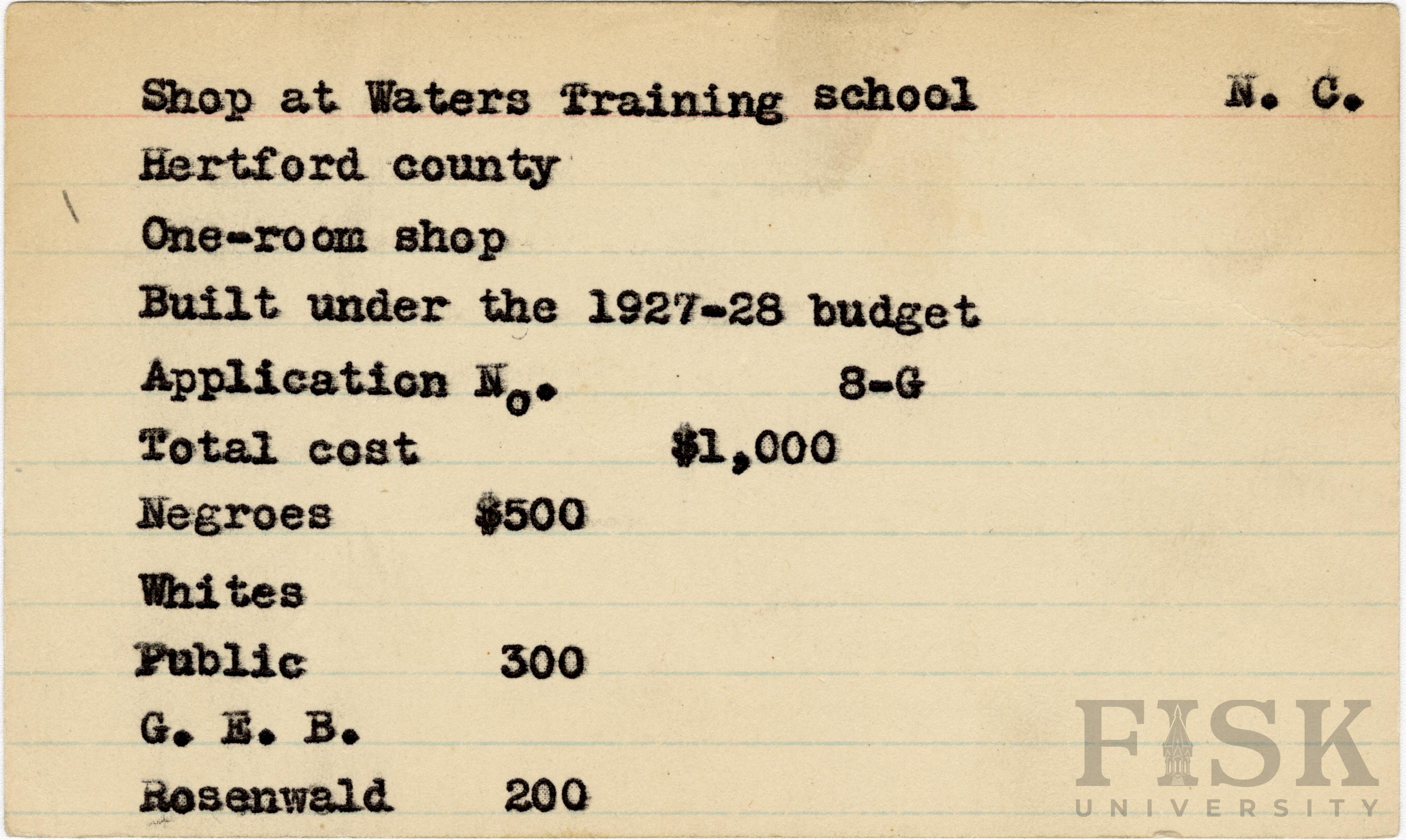 - School card for the one room shop at Waters Training School in Hertford County, North Carolina with a section added to the budget contributions that says, "G.E.B." that has no monetary value added to it.