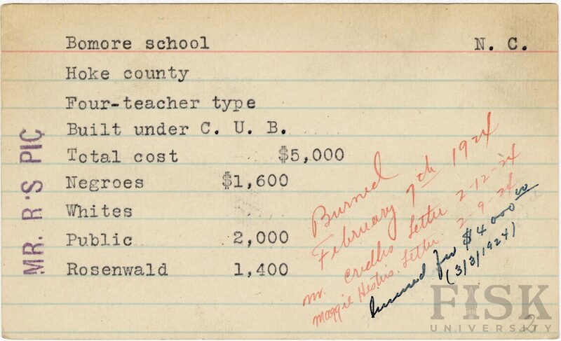 - School card for Bomore School in Hoke County, North Carolina with notes on the card that say, "Mr. R's Pic" and "Burned February 7th, 1924. Mr. [unclear] letter 2-12-24. Maggie Hester's letter 2-9-24. Insurance for $4,000.00 (3/3/1924)"
