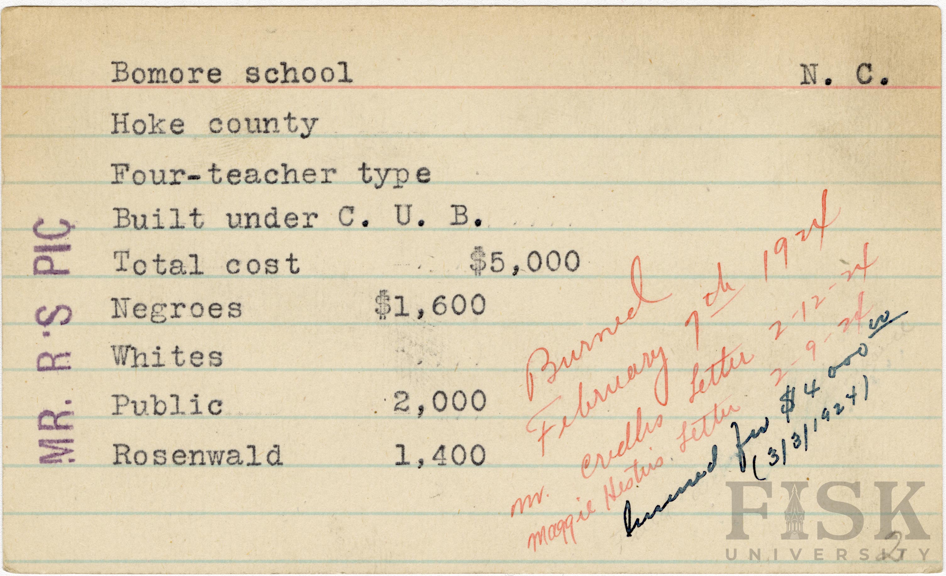 School card for Bomore School in Hoke County, North Carolina with notes on the card that say, "Mr. R's Pic" and "Burned February 7th, 1924. Mr. [unclear] letter 2-12-24. Maggie Hester's letter 2-9-24. Insurance for $4,000.00 (3/3/1924)"