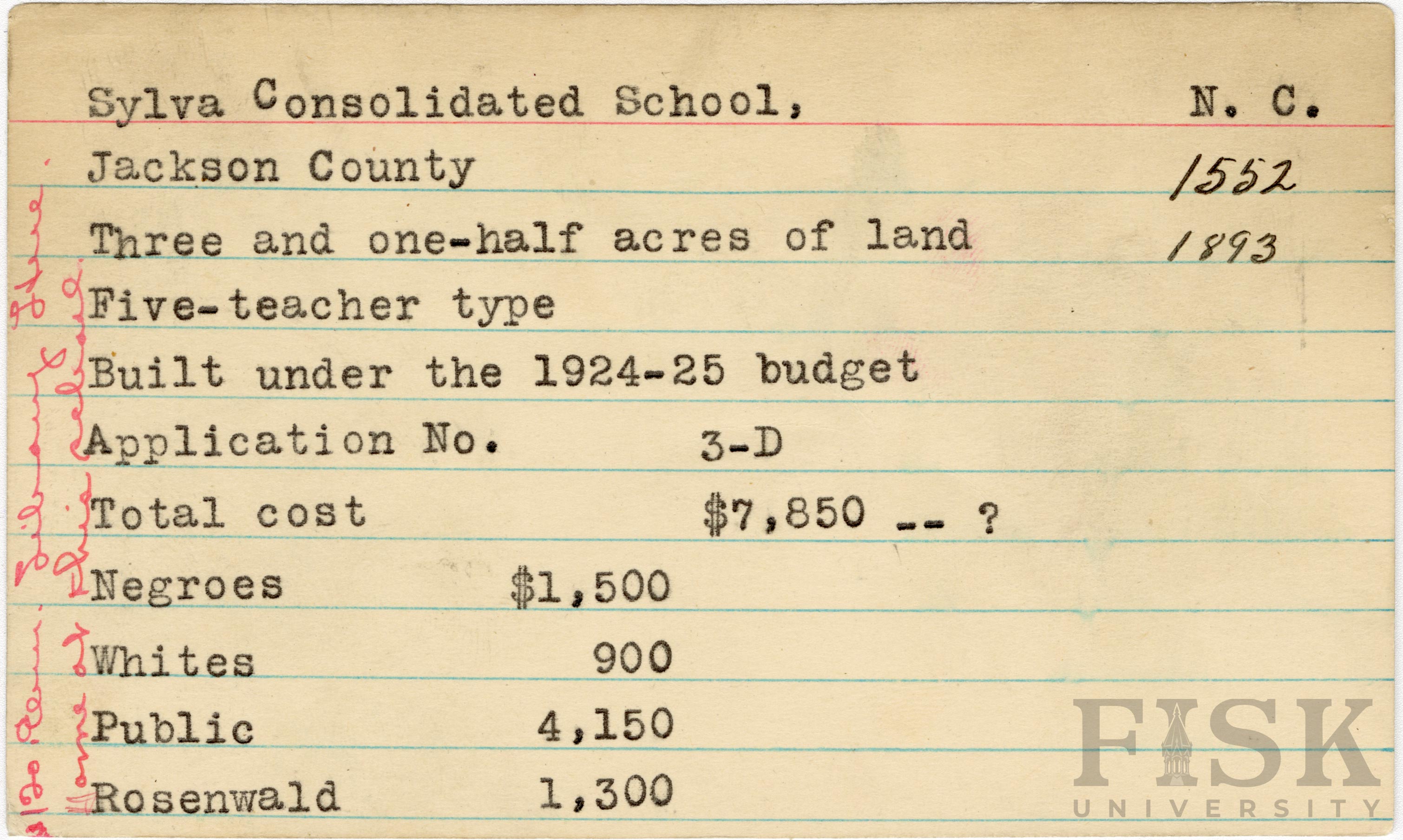 School card for Sylva School in Jackson County, North Carolina with a handwritten note on the left that says, "$120 Elem. Library here." and "Home at this school."