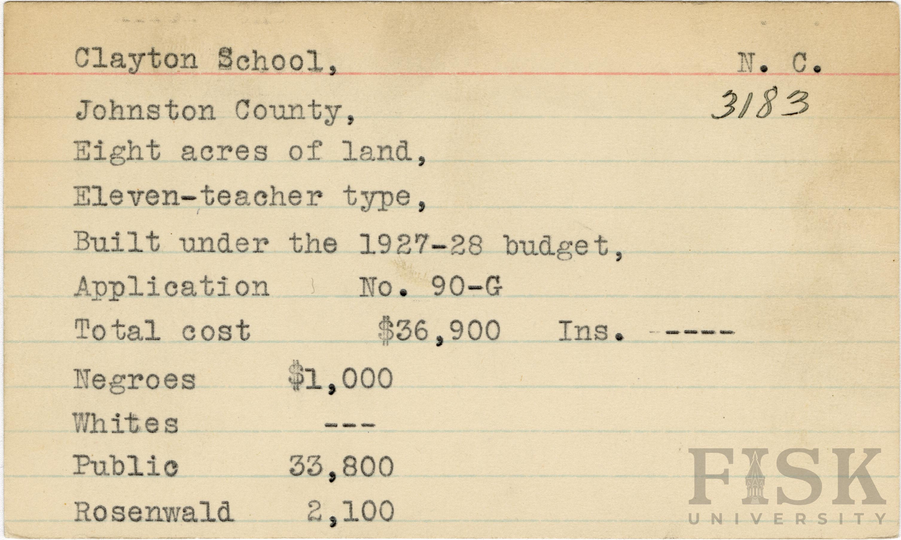 - Julius Rosenwald Fund--Buildings, African American schools--History--20th century, African American schools--Clayton School