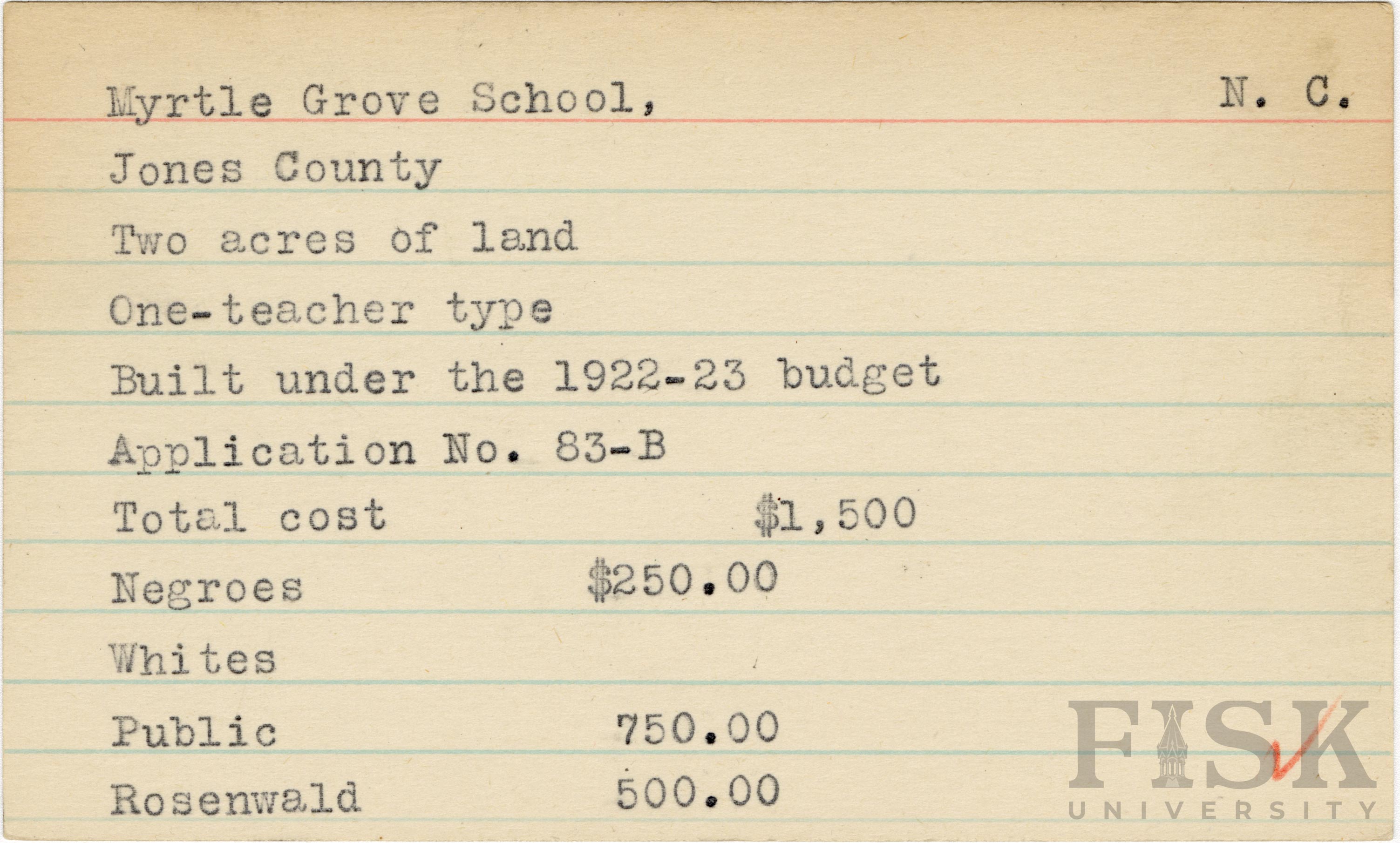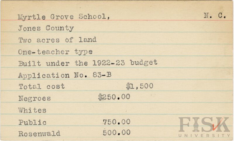 School card for Myrtle Grove School in Jones County, North Carolina