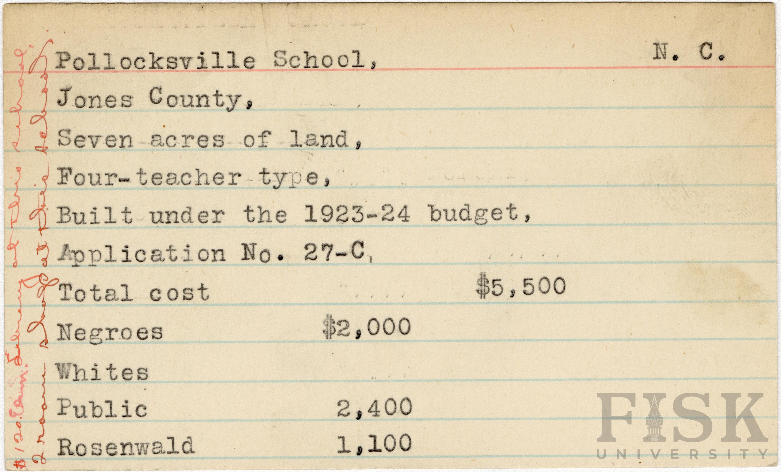 - School card for Pollocksville School in Jones County, North Carolina with handwritten notes on the far left of the card that says, "$120 elem library at this school" and "2 room shop at this school"