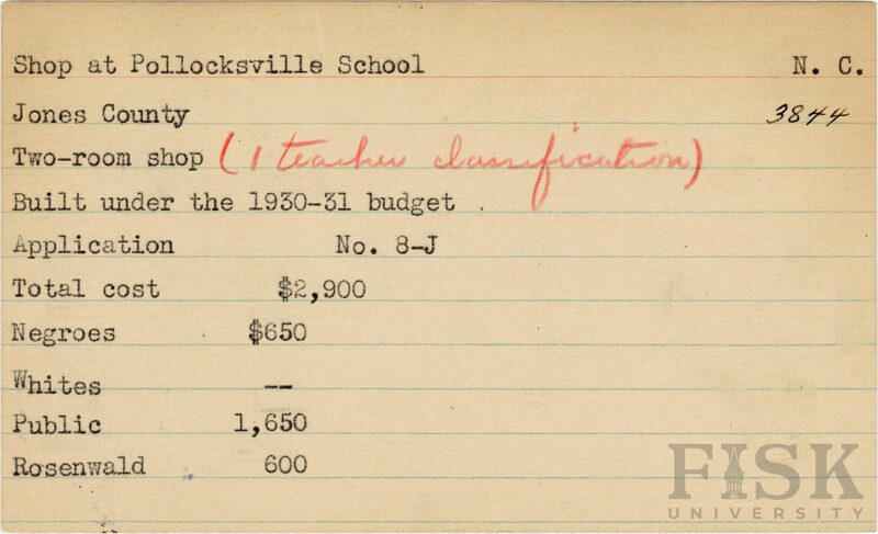 - Julius Rosenwald Fund--Buildings, African American schools--History--20th century, African American schools--Pollocksville School