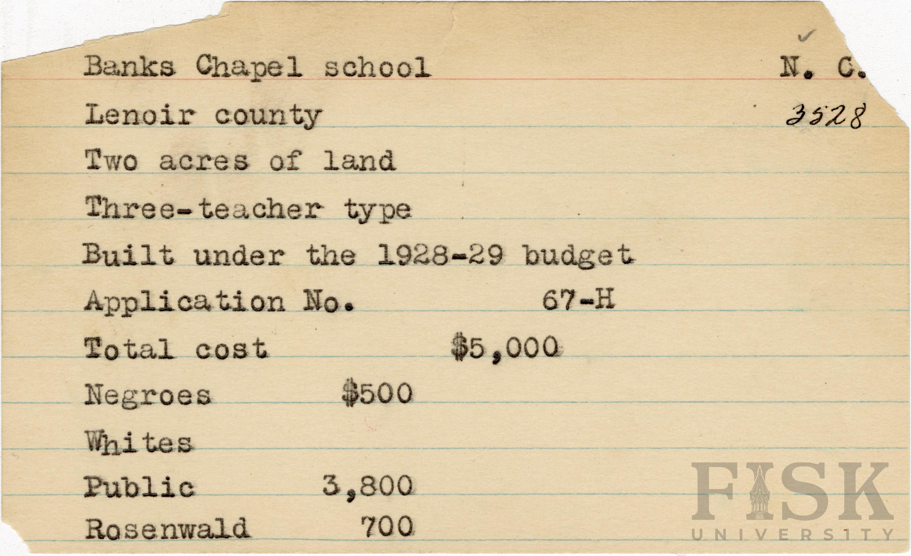 - Julius Rosenwald Fund--Buildings, African American schools--History--20th century, African American schools--Banks Chapel School